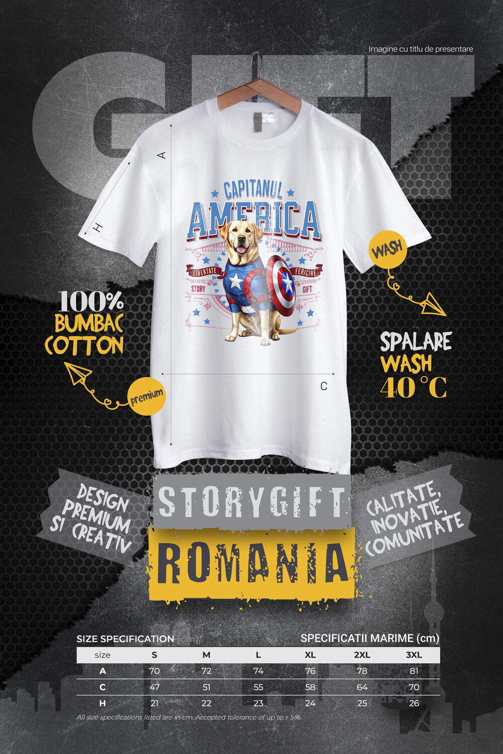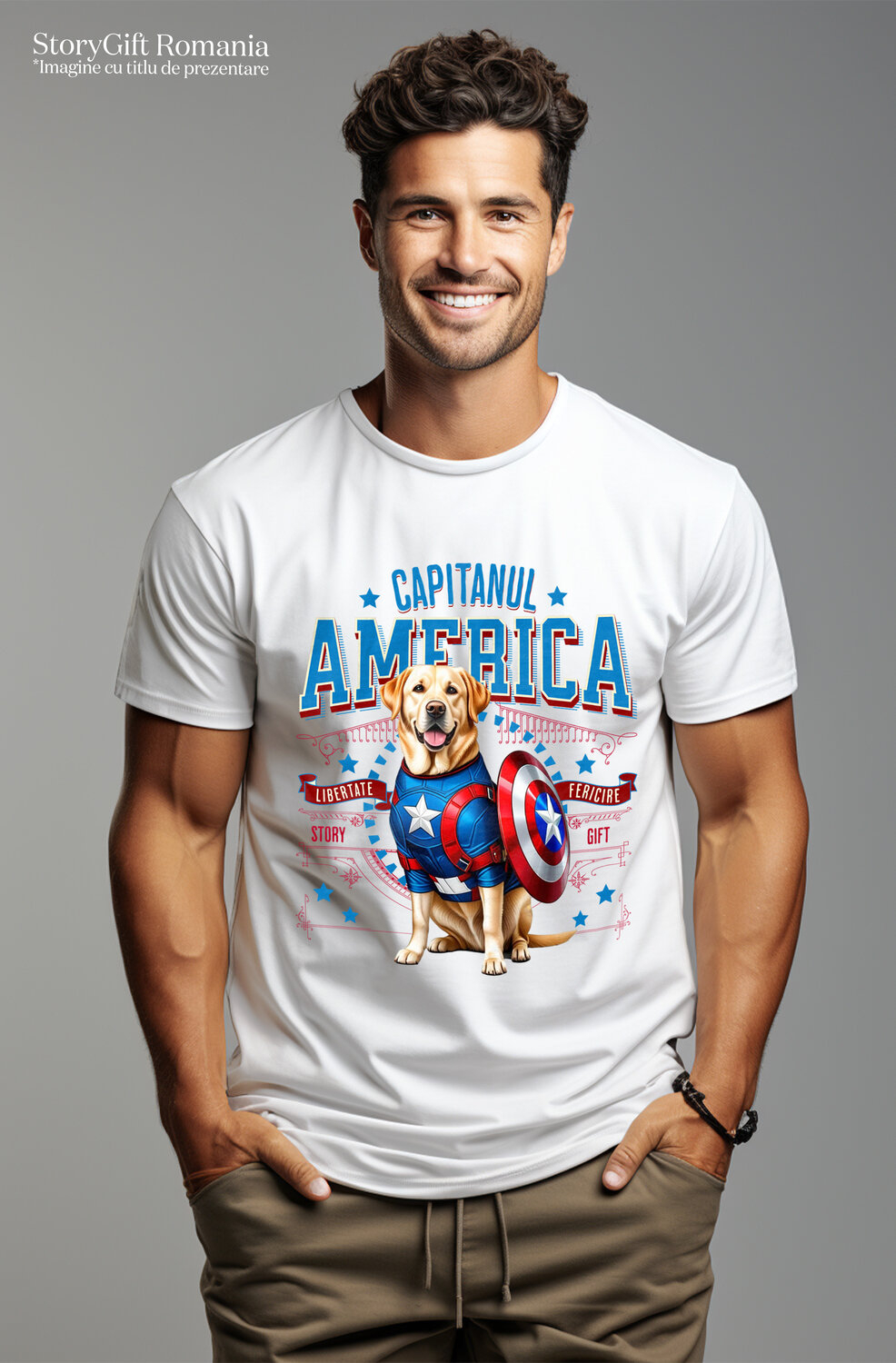Tricou Barbati cu Labrador Retriever Caine In Costum de Capitan America cu Pelerina, Erou Nocturn, Desene animate, Copii, Iubitorii de Animale cu imprimeu pe Fata, 100% Bumbac, Alb, L