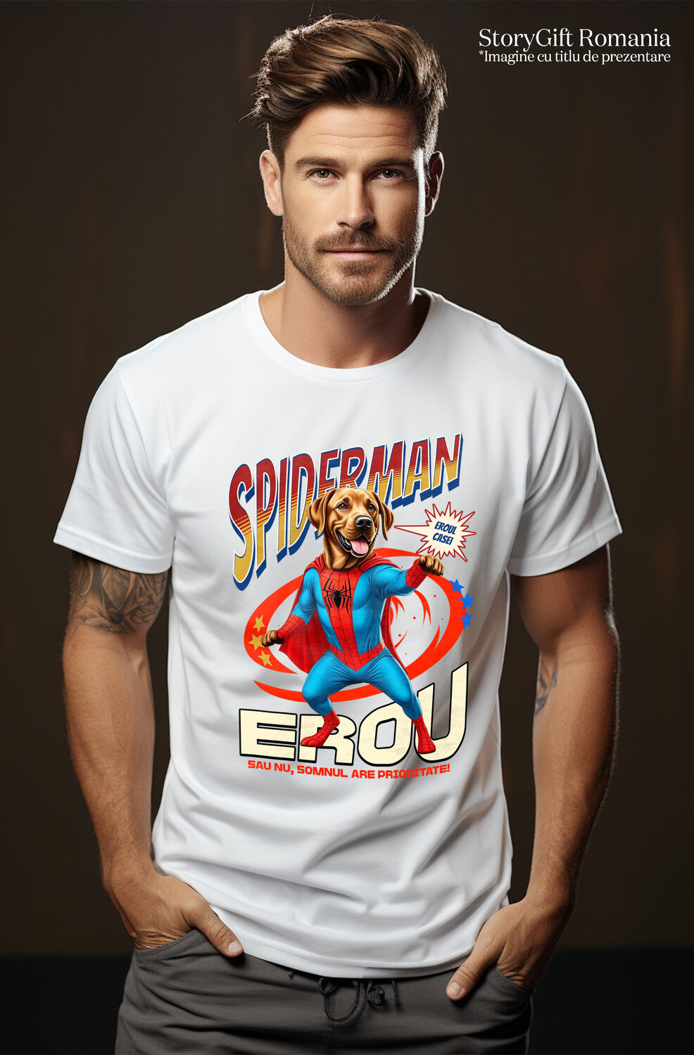 Tricou Barbati cu Labrador Retriever Caine In Costum de SpiderMan cu Pelerina, Erou Nocturn, Desene animate, Copii, Iubitorii de Animale cu imprimeu pe Fata, 100% Bumbac, Alb, S