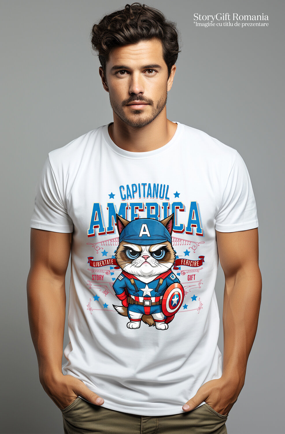 Tricou Barbati cu Pisica Morocănoasă / Grumpy Cat Pisica In Costum de Capitan America cu Pelerina, Erou Nocturn, Desene animate, Copii, Iubitorii de Animale cu imprimeu pe Fata, 100% Bumbac, Alb, L