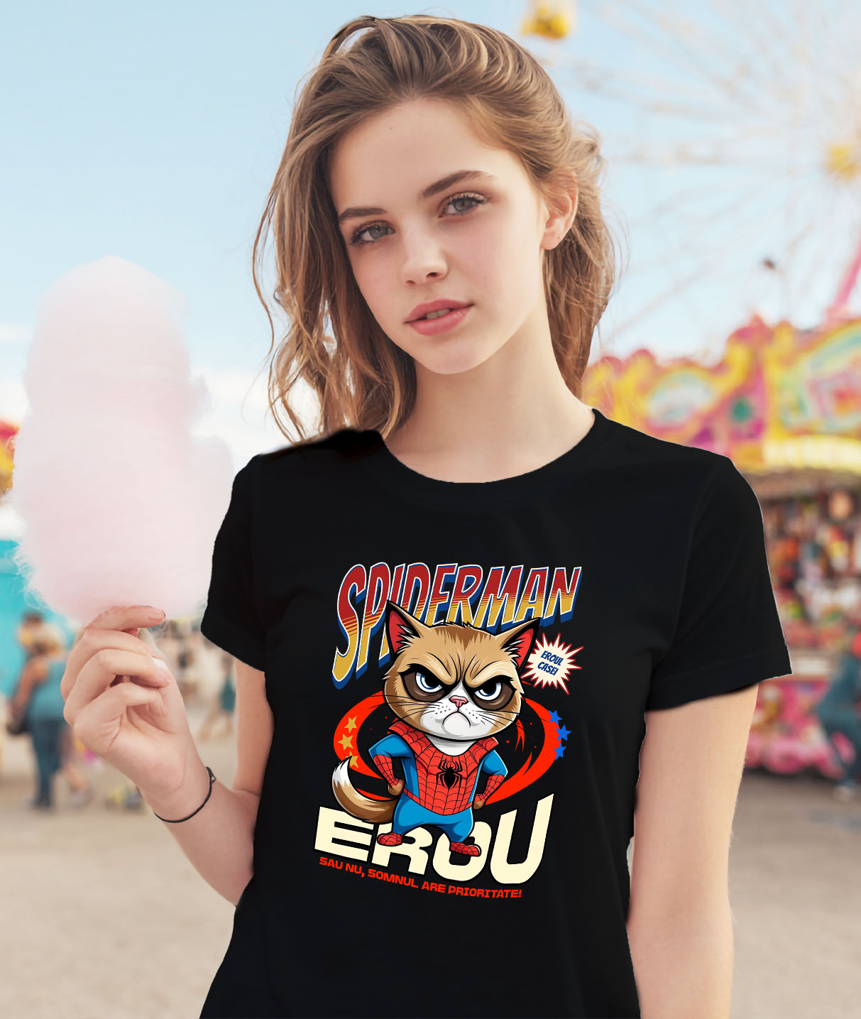 Tricou Femei cu Pisica Morocănoasă / Grumpy Cat Pisica In Costum de SpiderMan cu Pelerina, Erou Nocturn, Desene animate, Copii, Iubitorii de Animale cu imprimeu pe Fata, 100% Bumbac, Negru, XL