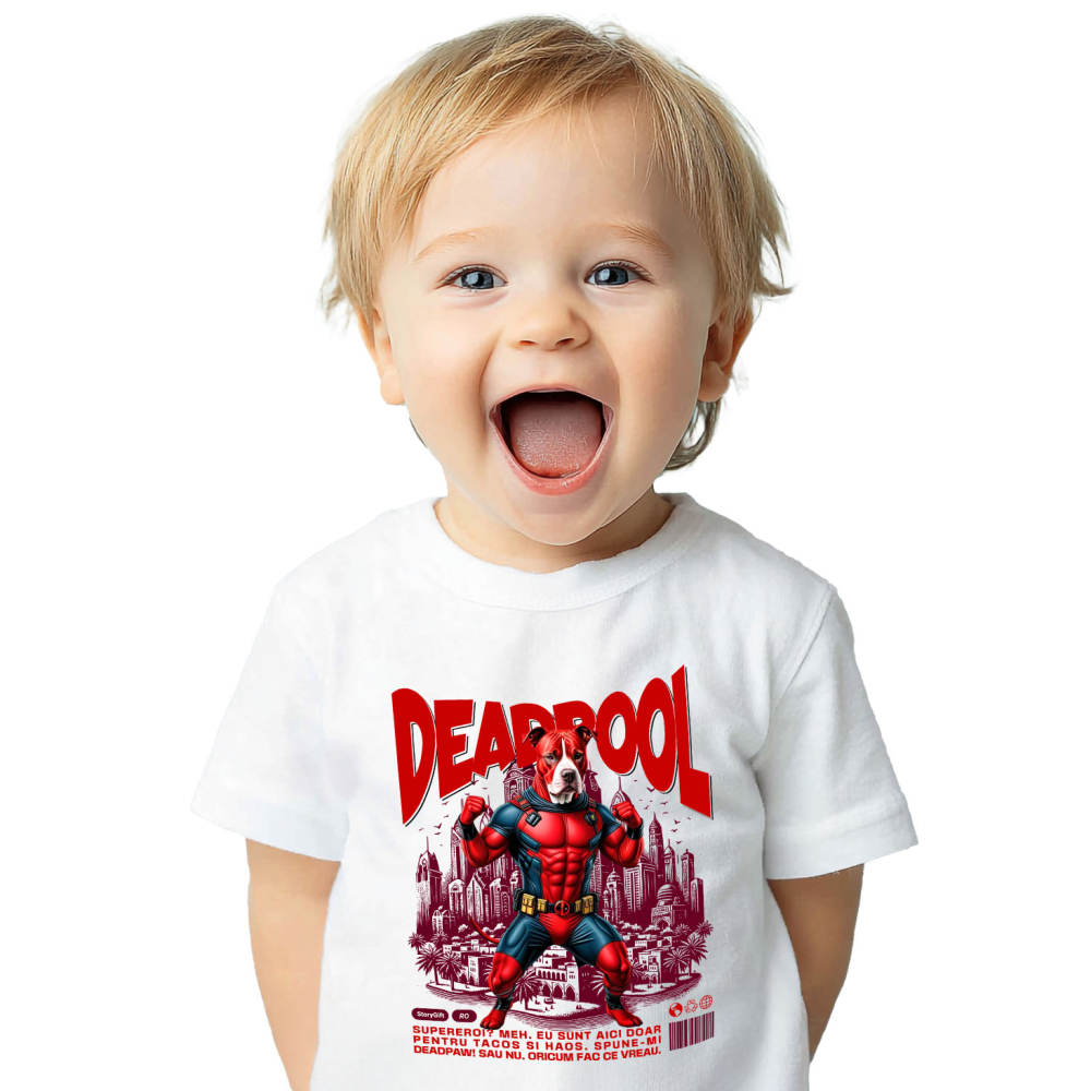 Tricou Copii cu PITBULL Caine In Costum de DeadPool cu Pelerina, Erou Nocturn, Desene animate, Copii, Iubitorii de Animale cu imprimeu pe Fata, 100% Bumbac, Alb, 12 Ani