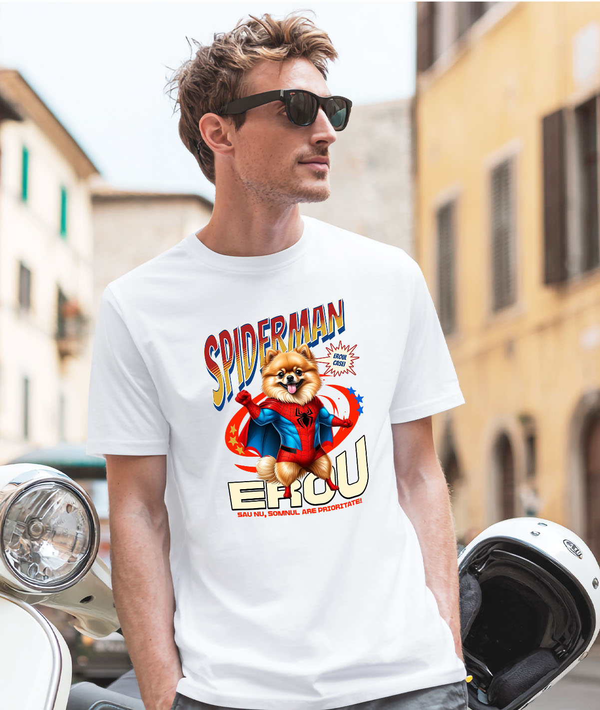 Tricou Barbati cu pomeranian Pisica In Costum de SpiderMan cu Pelerina, Erou Nocturn, Desene animate, Copii, Iubitorii de Animale cu imprimeu pe Fata, 100% Bumbac, Alb, L