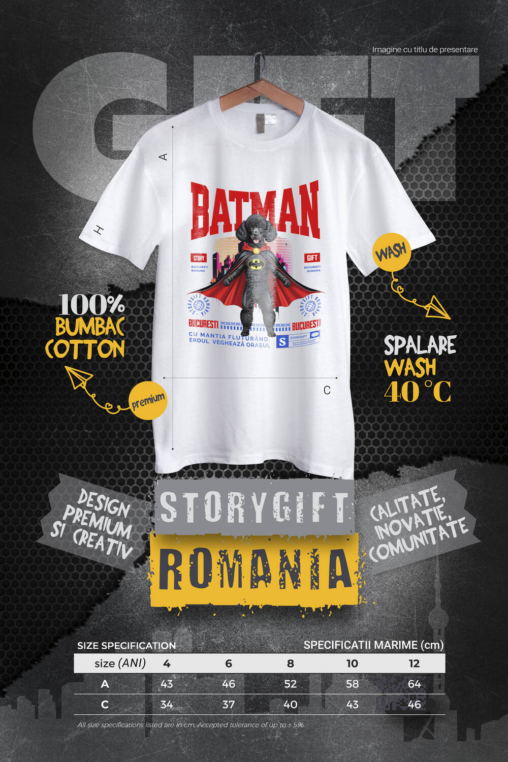 Tricou Copii cu Pudel / Poodle Caine In Costum de BatMan cu Pelerina, Erou Nocturn, Desene animate, Copii, Iubitorii de Animale cu imprimeu pe Fata, 100% Bumbac, Alb, 12 Ani