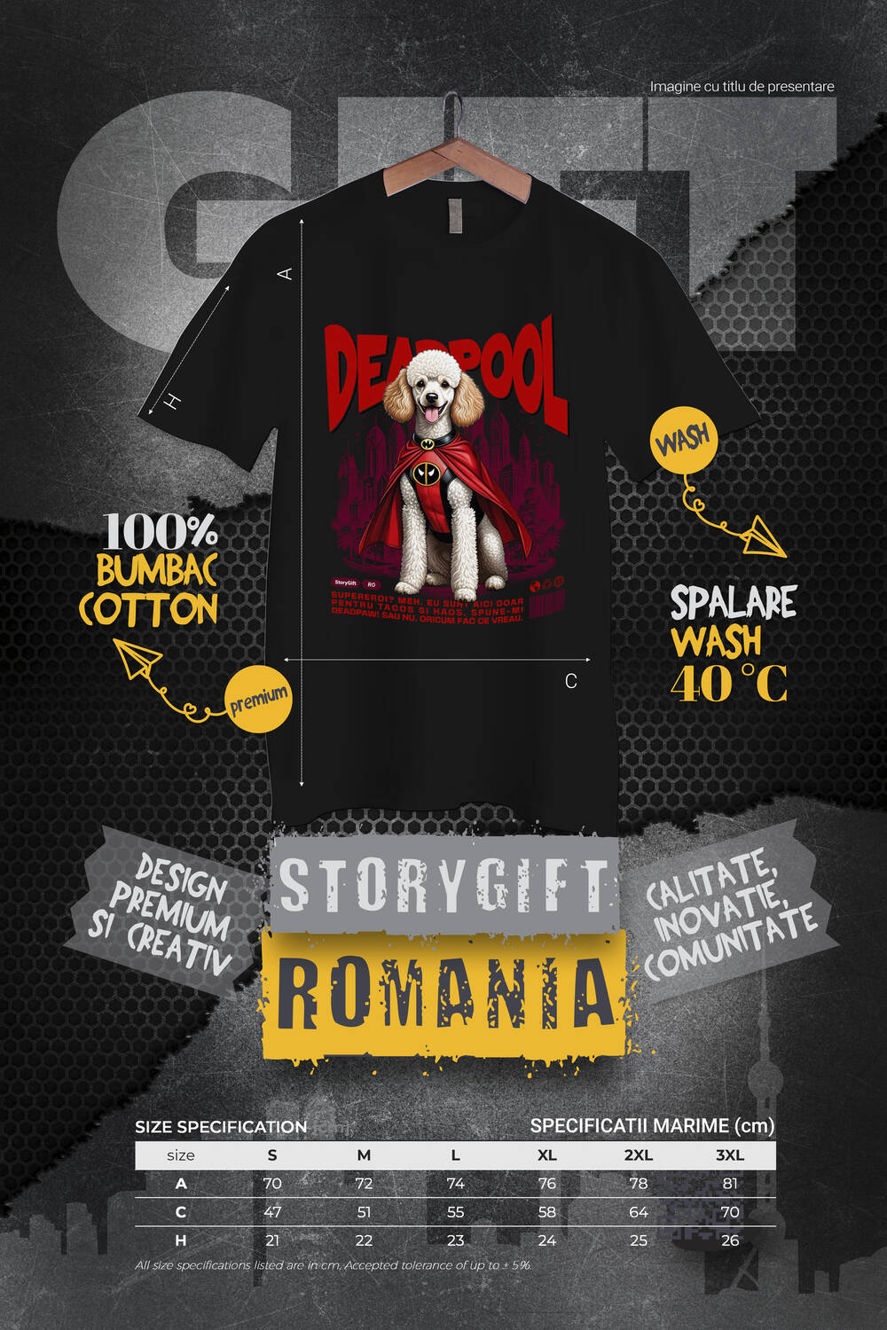 Tricou Barbati cu Pudel / Poodle Caine In Costum de DeadPool cu Pelerina, Erou Nocturn, Desene animate, Copii, Iubitorii de Animale cu imprimeu pe Fata, 100% Bumbac, Negru, L