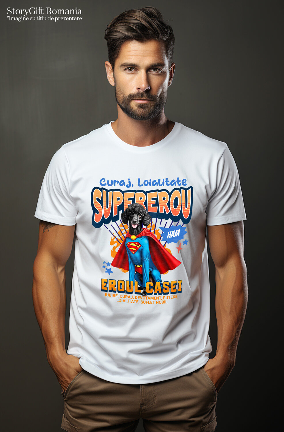 Tricou Barbati cu Pudel / Poodle Caine In Costum de SuperMan cu Pelerina, Erou Nocturn, Desene animate, Copii, Iubitorii de Animale cu imprimeu pe Fata, 100% Bumbac, Alb, XL