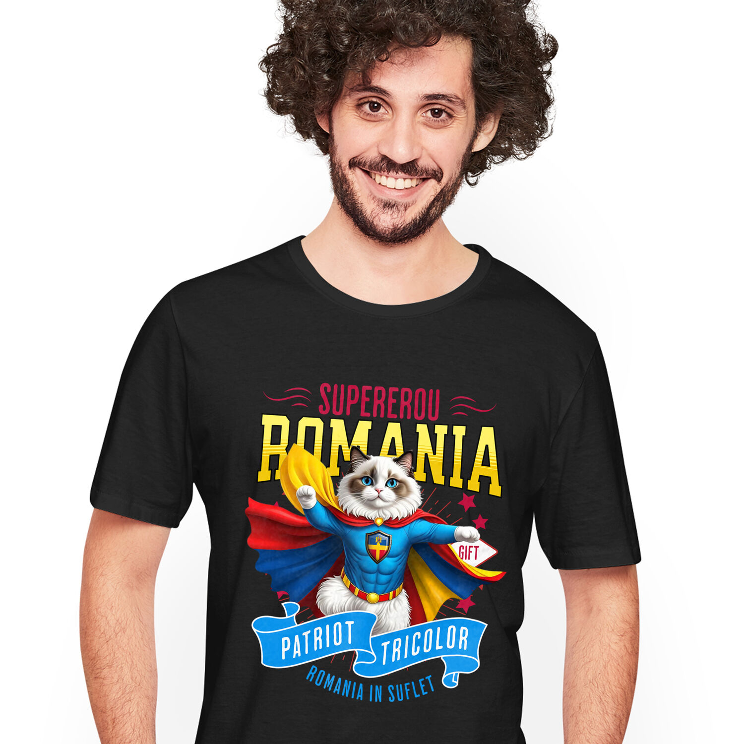 Tricou Barbati cu Ragdoll Pisica In Costum de Capitan Romania cu Pelerina, Erou Nocturn, Desene animate, Copii, Iubitorii de Animale cu imprimeu pe Fata, 100% Bumbac, Negru, L