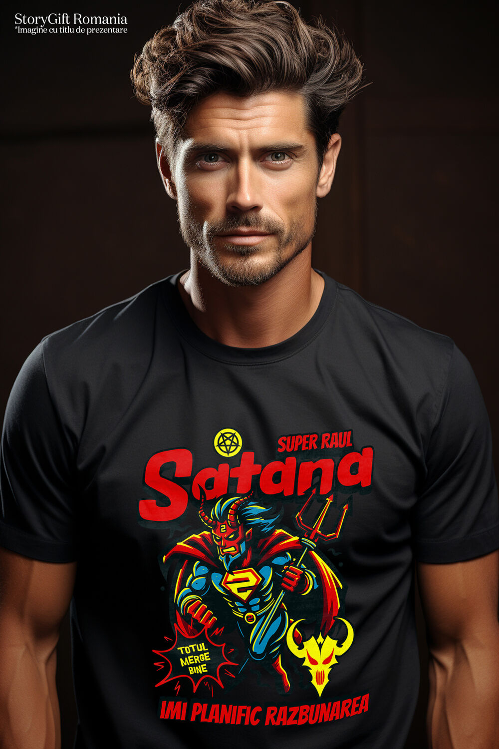 Tricou Barbati cu Satana Diavol In Costum De Super erou Cu Coarne Si Coada cu imprimeu pe Fata, 100% Bumbac, Negru, L