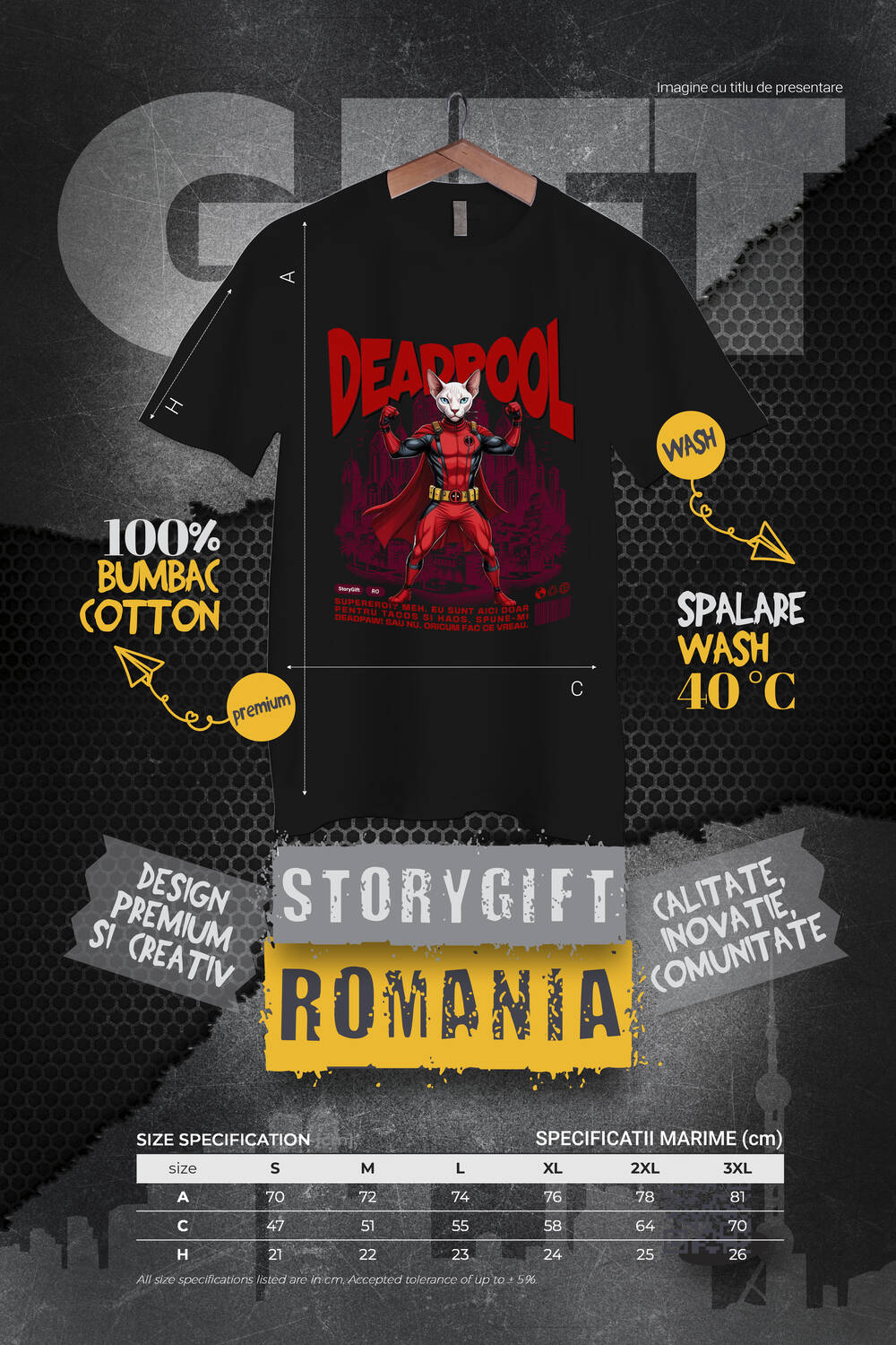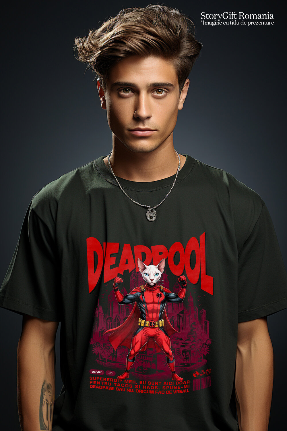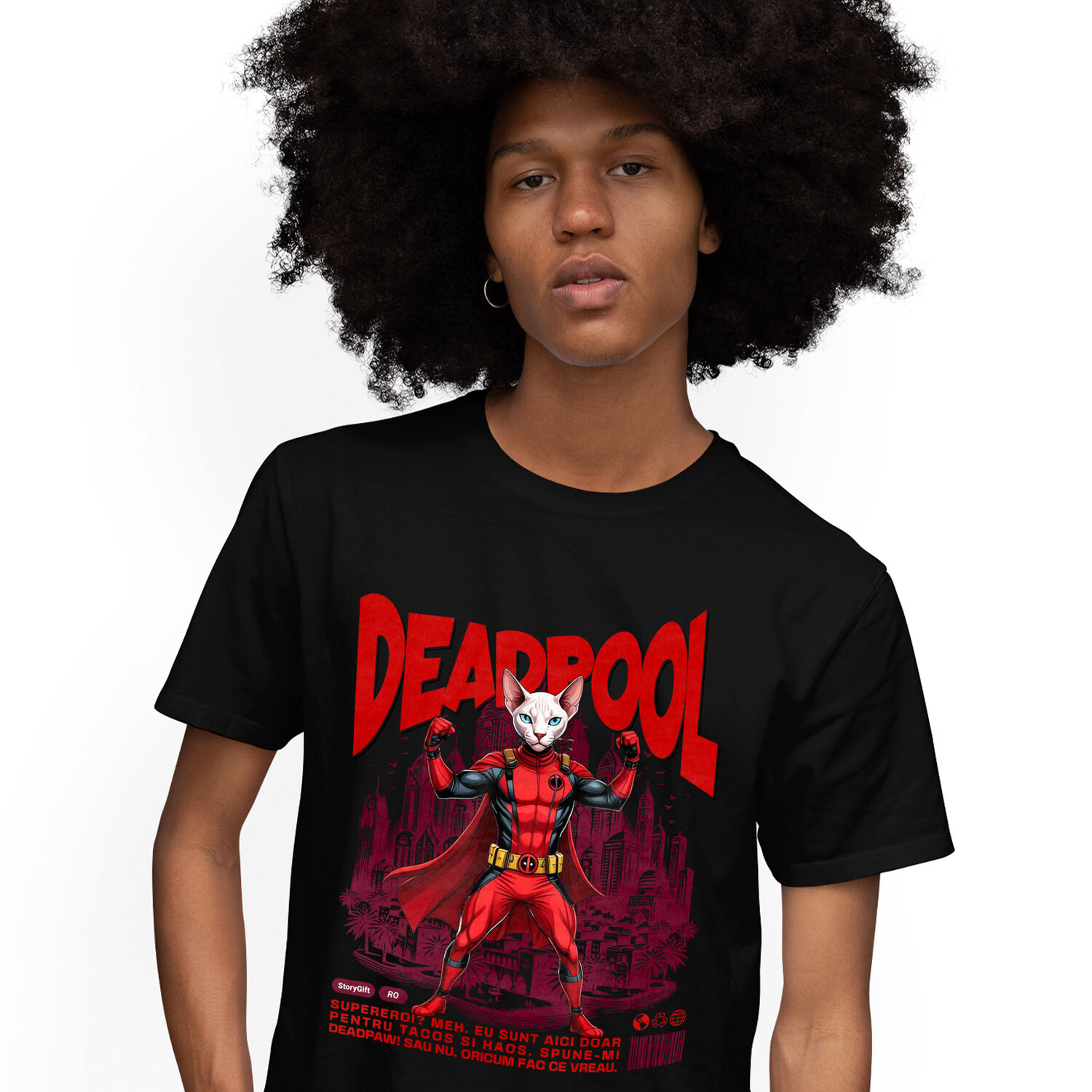 Tricou Barbati cu Sphynx Pisica In Costum de DeadPool cu Pelerina, Erou Nocturn, Desene animate, Copii, Iubitorii de Animale cu imprimeu pe Fata, 100% Bumbac, Negru, L