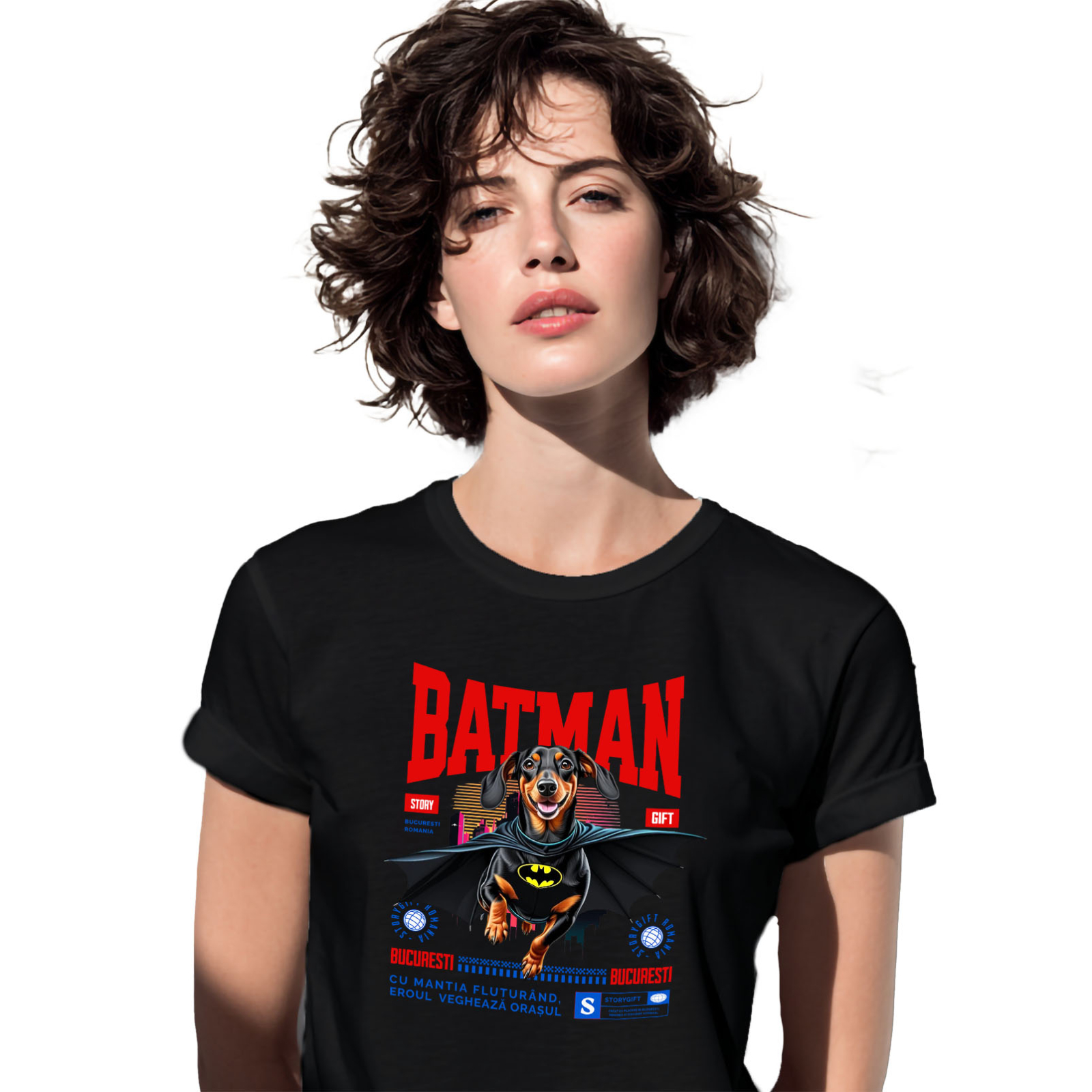 Tricou Femei cu Teckel / Dachshund Caine In Costum de BatMan cu Pelerina, Erou Nocturn, Desene animate, Copii, Iubitorii de Animale cu imprimeu pe Fata, 100% Bumbac, Negru, L