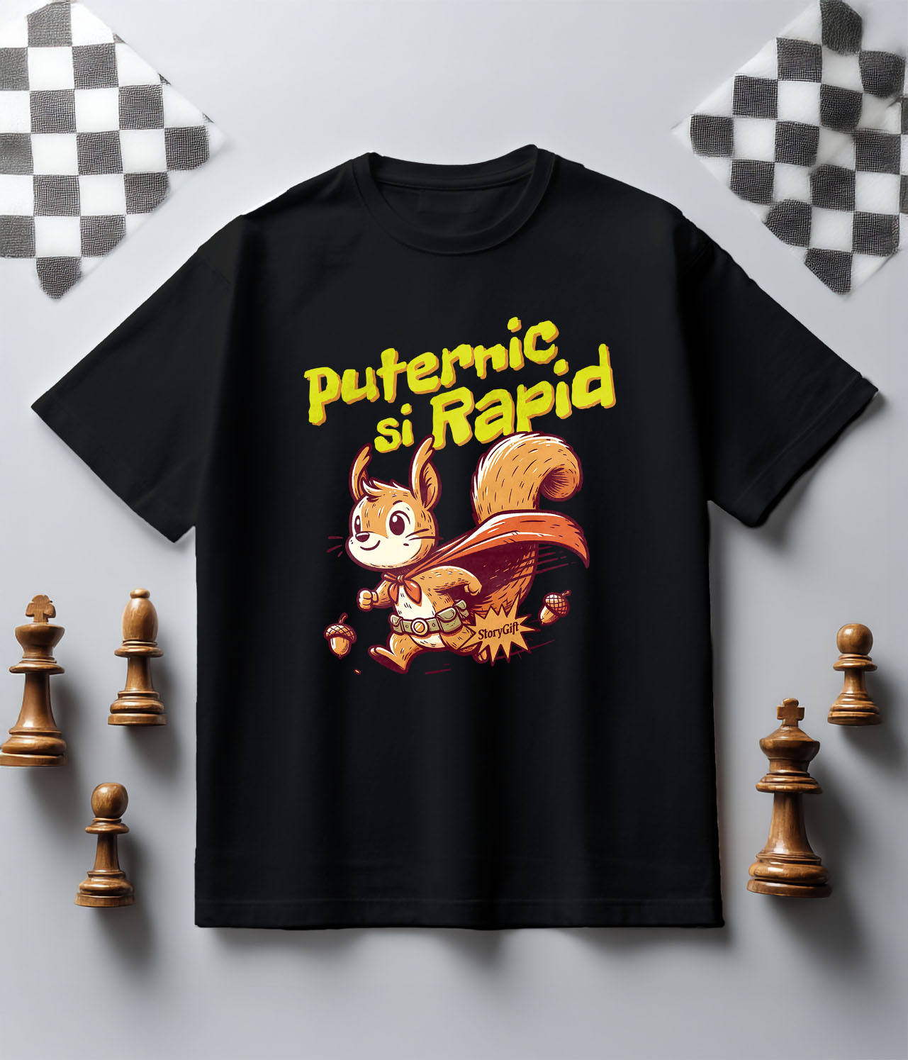 Tricou Copii cu Veverita Si Pelerina De Super Erou Curcubeu Colorat cu imprimeu pe Fata, 100% Bumbac, Negru, 10 Ani
