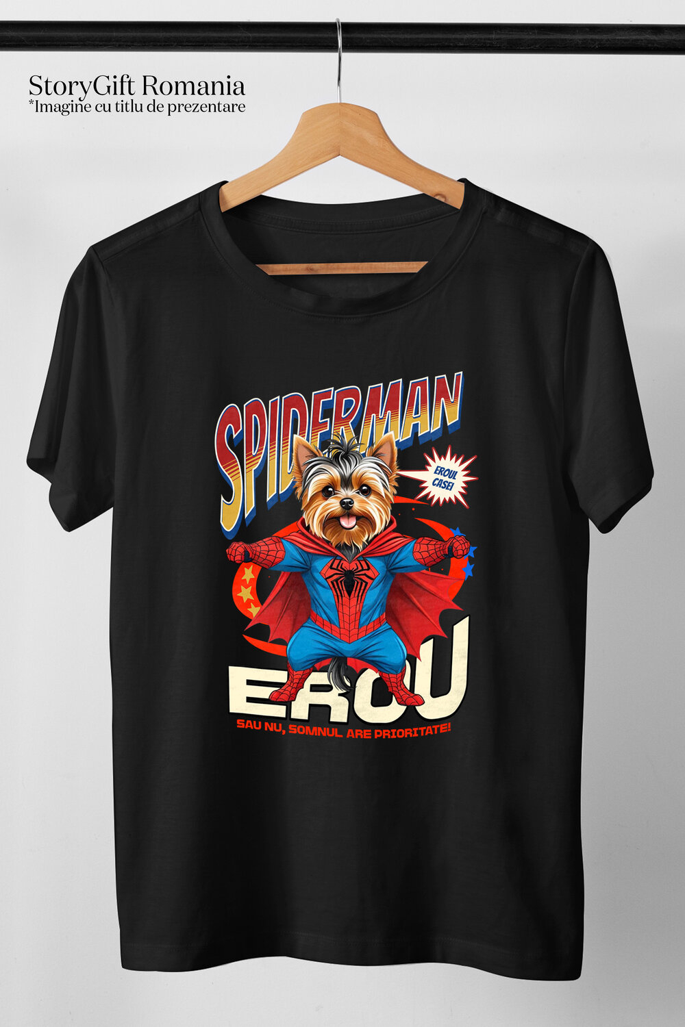Tricou Barbati cu Yorkshire Terrier Caine In Costum de SpiderMan cu Pelerina, Erou Nocturn, Desene animate, Copii, Iubitorii de Animale cu imprimeu pe Fata, 100% Bumbac, Negru, L