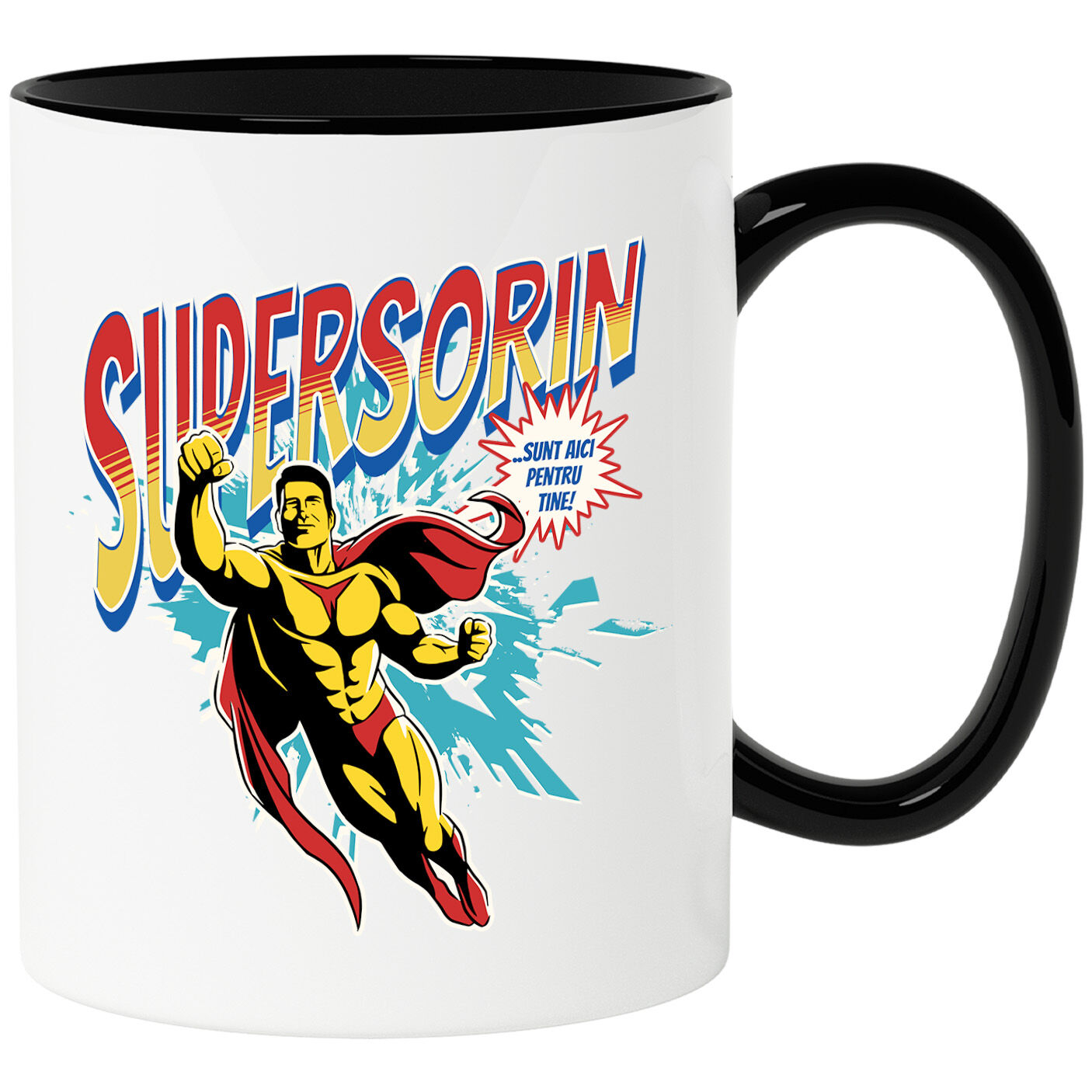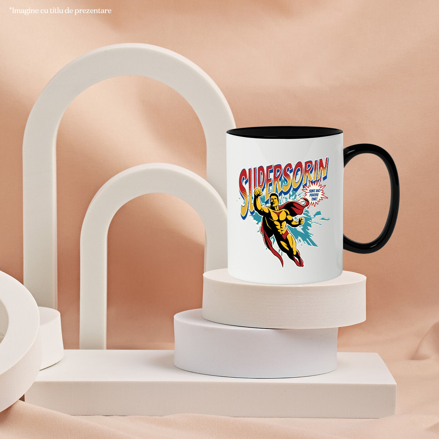 Cana Personalizata cu Barbat Puternic In Zbor Super erou Costum Desene Animate , Ceramica, 330ML, cu Maner Negru