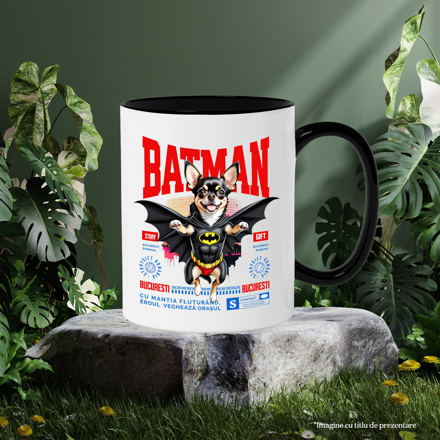 Cana Personalizata cu Chihuahua / Chihuahua Caine In Costum de BatMan cu Pelerina, Erou Nocturn, Desene animate, Copii, Iubitorii de Animale, Ceramica, 330ML, cu Maner Negru