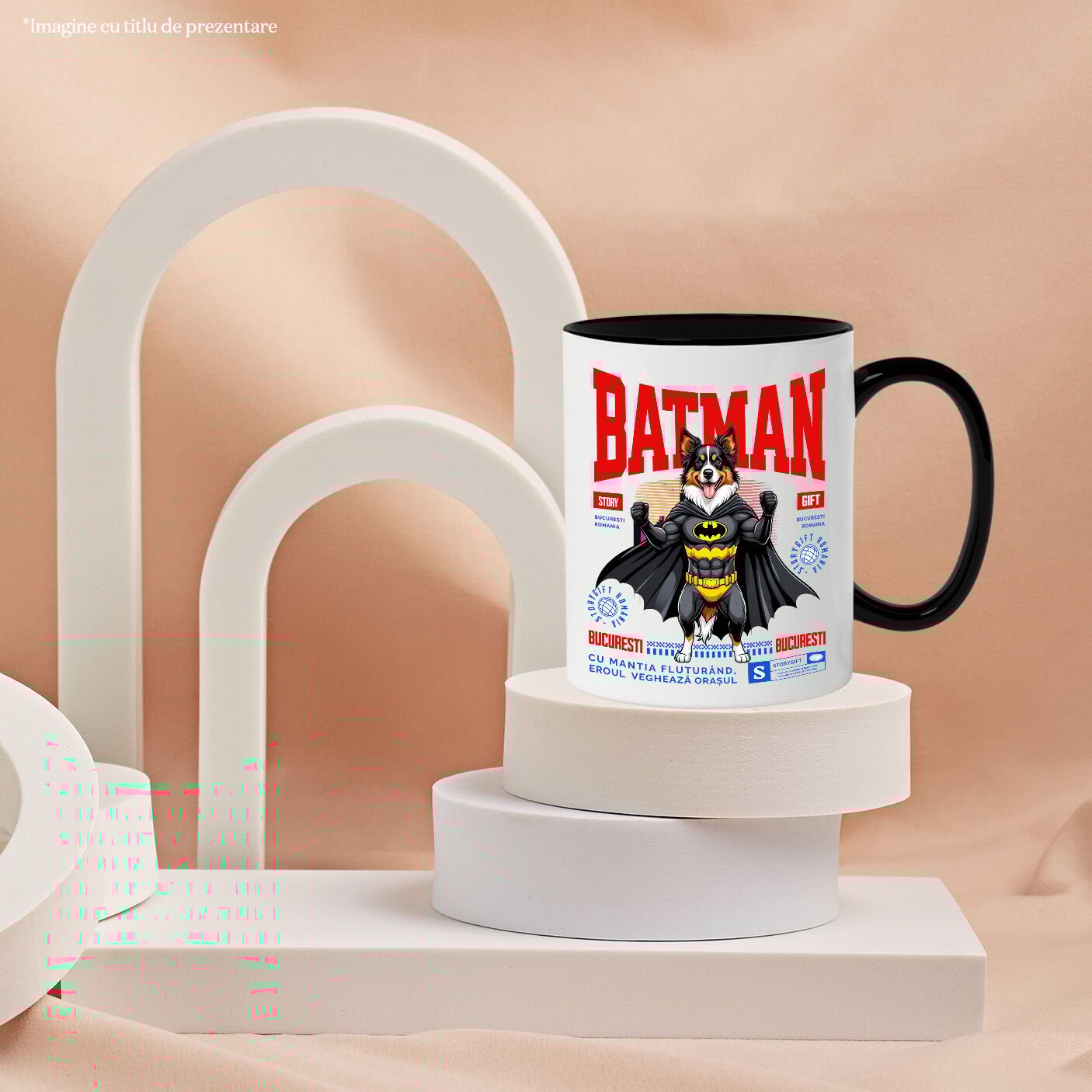 Cana Personalizata cu Ciobănesc Australian / Australian ShepherdCaine In Costum de BatMan cu Pelerina, Erou Nocturn, Desene animate, Copii, Iubitorii de Animale, Ceramica, 330ML, cu Maner Negru