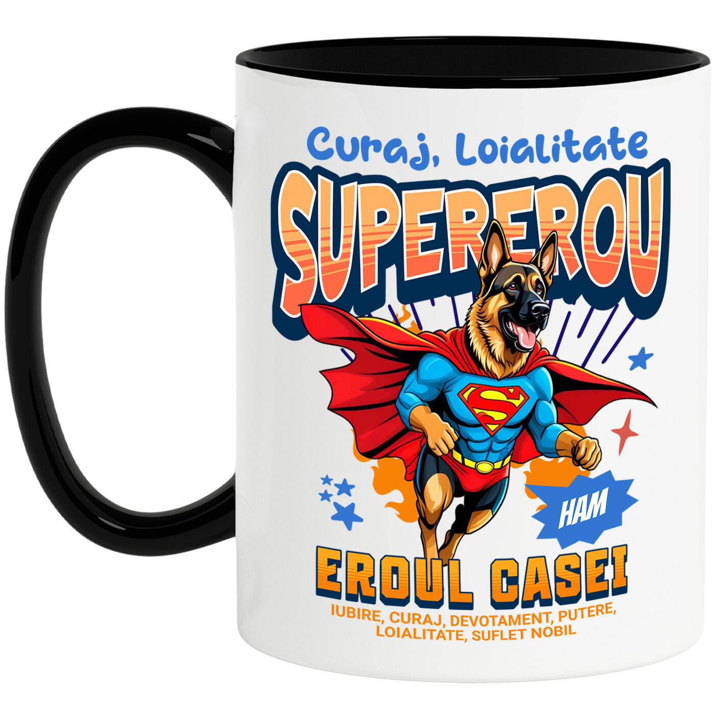 Cana Personalizata cu Ciobănesc German / German Shepherd Caine In Costum de SuperMan cu Pelerina, Erou Nocturn, Desene animate, Copii, Iubitorii de Animale, Ceramica, 330ML, cu Maner Negru