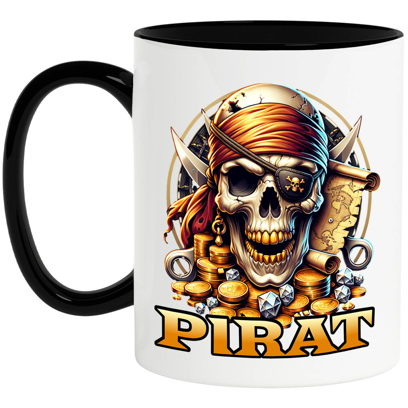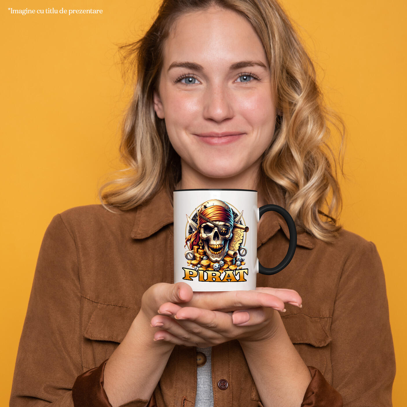 Cana Personalizata cu Craniu uman Mort Pirat Cu Dinti De Aur Si Bandana, Monede Si Diamante , Ceramica, 330ML, cu Maner Negru