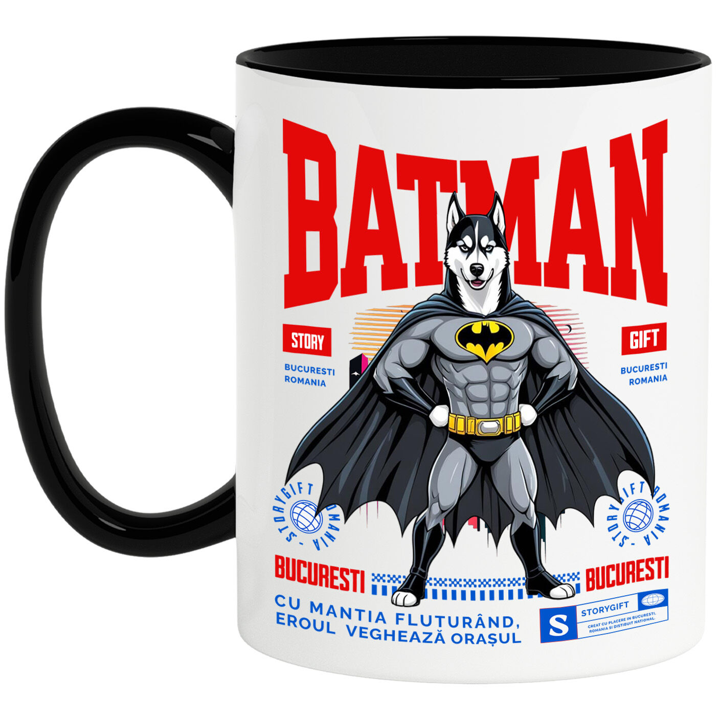 Cana Personalizata cu Husky Siberian / Siberian Husky Caine In Costum de BatMan cu Pelerina, Erou Nocturn, Desene animate, Copii, Iubitorii de Animale, Ceramica, 330ML, cu Maner Negru