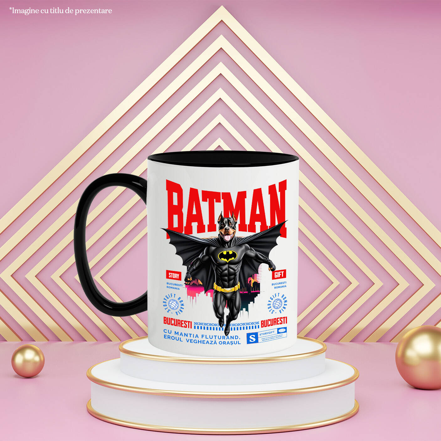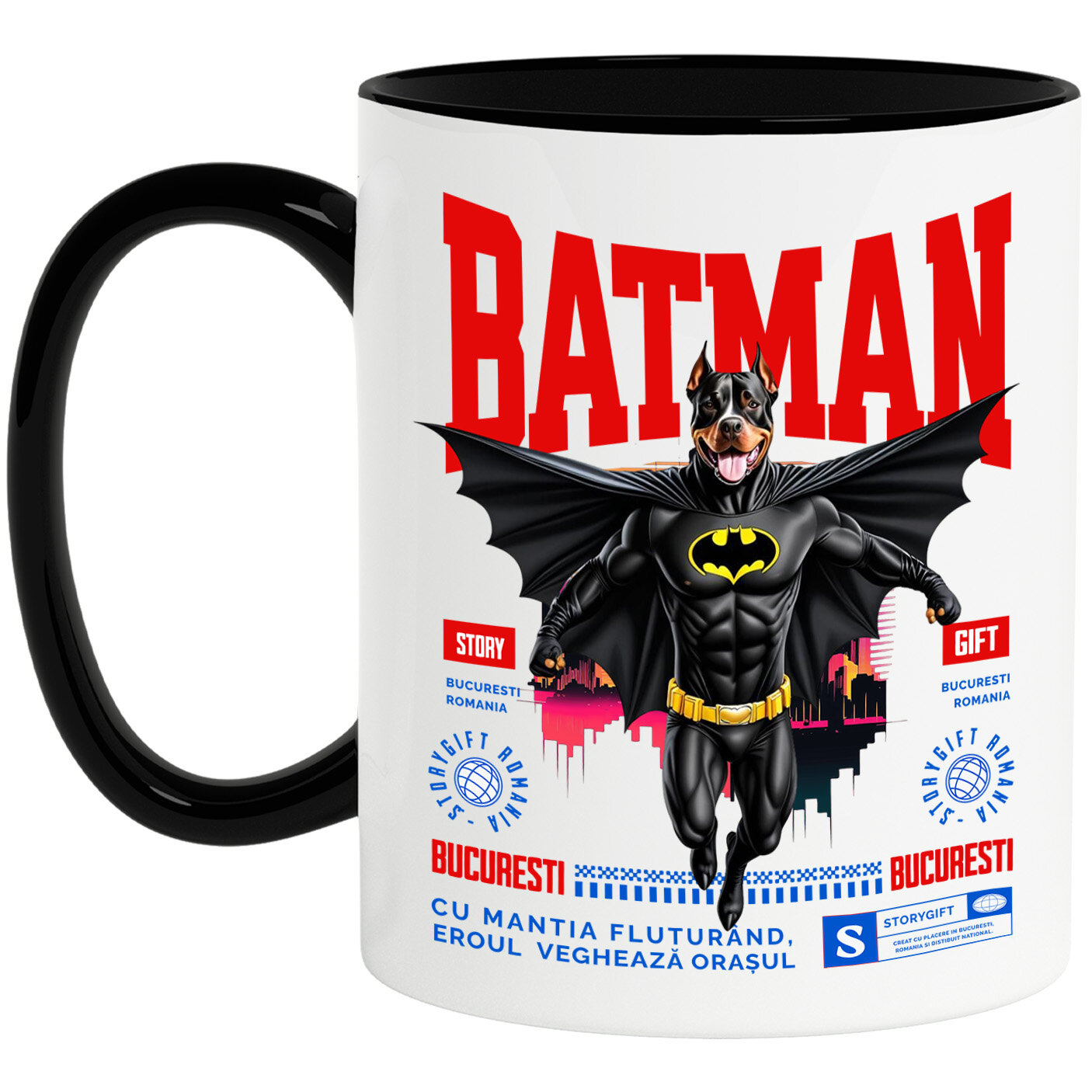 Cana Personalizata cu PITBULL Caine In Costum de BatMan cu Pelerina, Erou Nocturn, Desene animate, Copii, Iubitorii de Animale, Ceramica, 330ML, cu Maner Negru