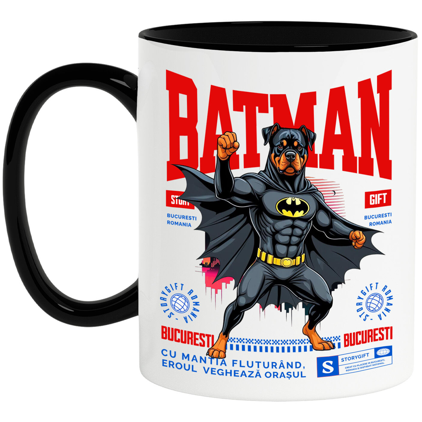 Cana Personalizata cu Rottweiler Caine In Costum de BatMan cu Pelerina, Erou Nocturn, Desene animate, Copii, Iubitorii de Animale, Ceramica, 330ML, cu Maner Negru