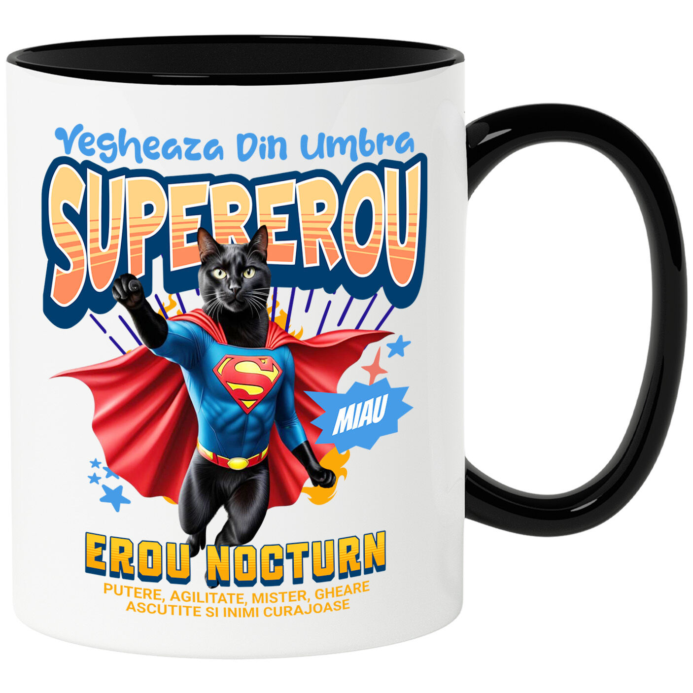Cana Personalizata cu Scottish Fold Caine In Costum de SuperMan cu Pelerina, Erou Nocturn, Desene animate, Copii, Iubitorii de Animale, Ceramica, 330ML, cu Maner Negru