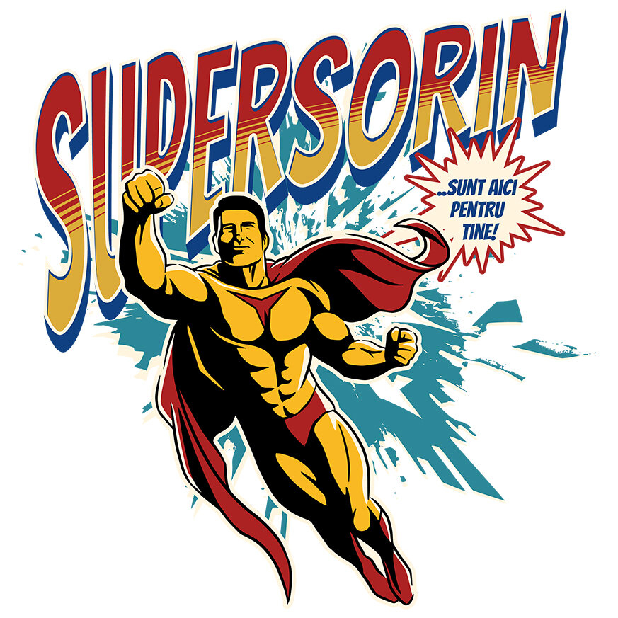 Sticker Personalizat cu Barbat Puternic In Zbor Super erou Costum Desene Animate cu Margini Albe, PVC Vinyl 10 cm