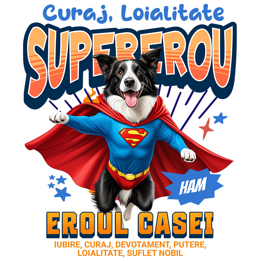 Sticker Personalizat cu Border Collie Caine In Costum de SuperMan cu Pelerina, Erou Nocturn, Desene animate, Copii, Iubitorii de Animale cu Margini Albe, PVC Vinyl 10 cm