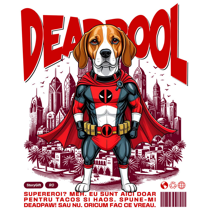 Sticker Personalizat cu boxer Caine In Costum de DeadPool cu Pelerina, Erou Nocturn, Desene animate, Copii, Iubitorii de Animale cu Margini Albe, PVC Vinyl 10 cm