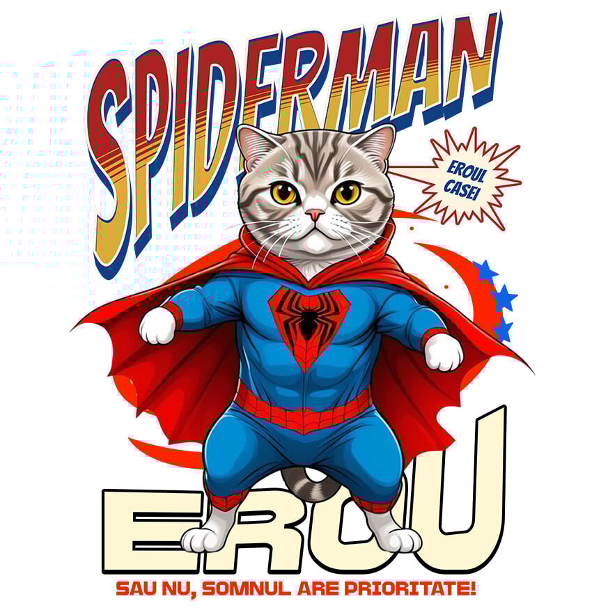 Sticker Personalizat cu Scottish Fold Pisica In Costum de SpiderMan cu Pelerina, Erou Nocturn, Desene animate, Copii, Iubitorii de Animale cu Margini Albe, PVC Vinyl 10 cm