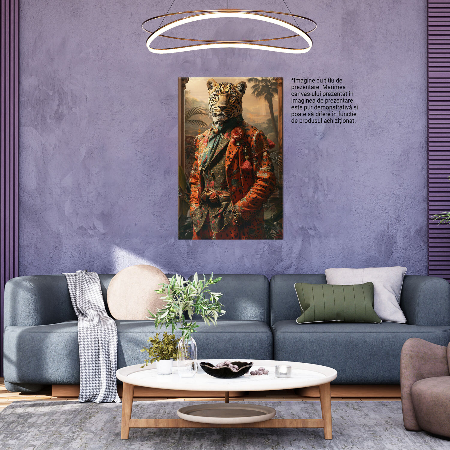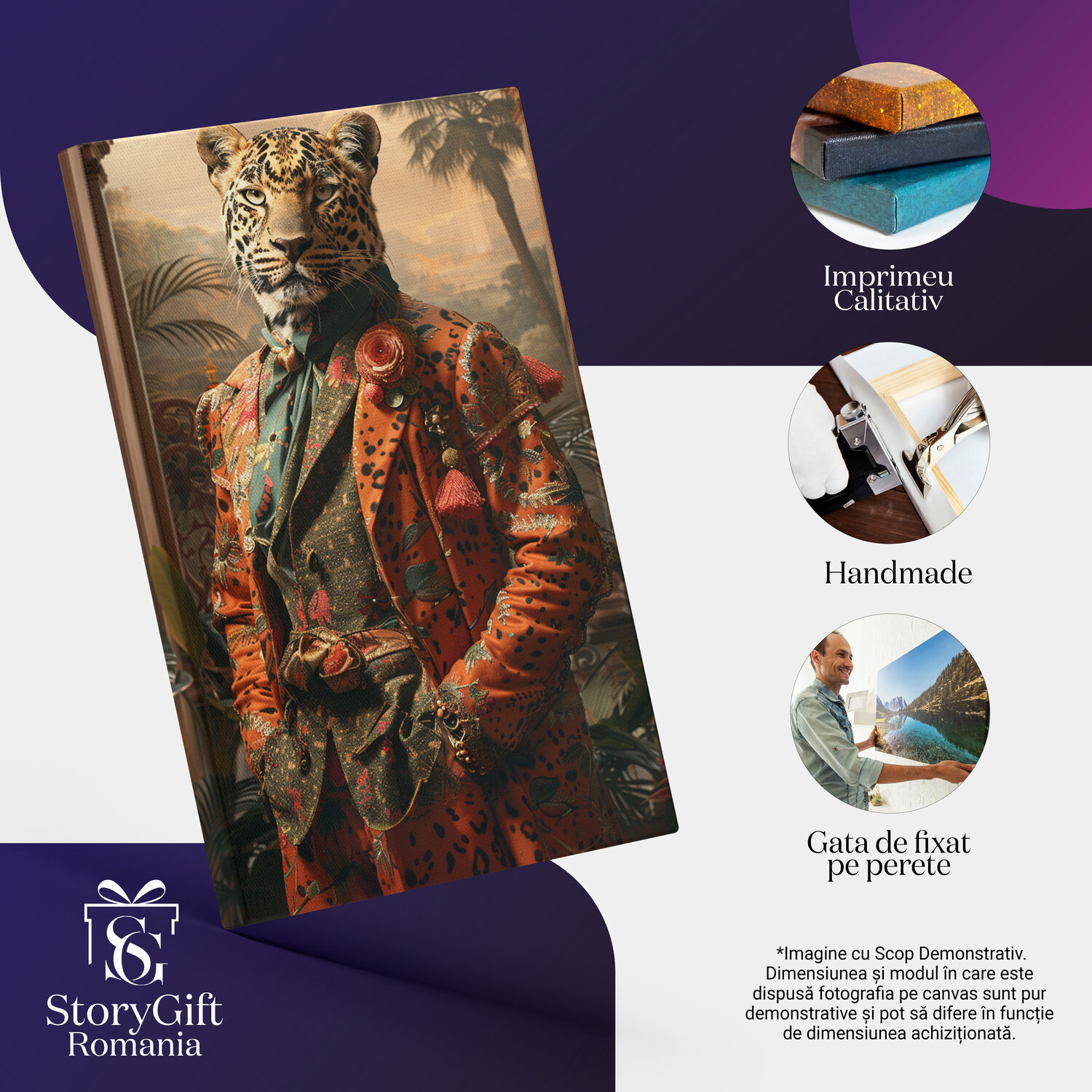 Tablou Canvas Costum rosu cu picatele pe felina Leopard - Palmieri si alte plante exotice in spatele felinei , Pictura Digitala - Tablou Canvas Signature de la StoryGift Romania