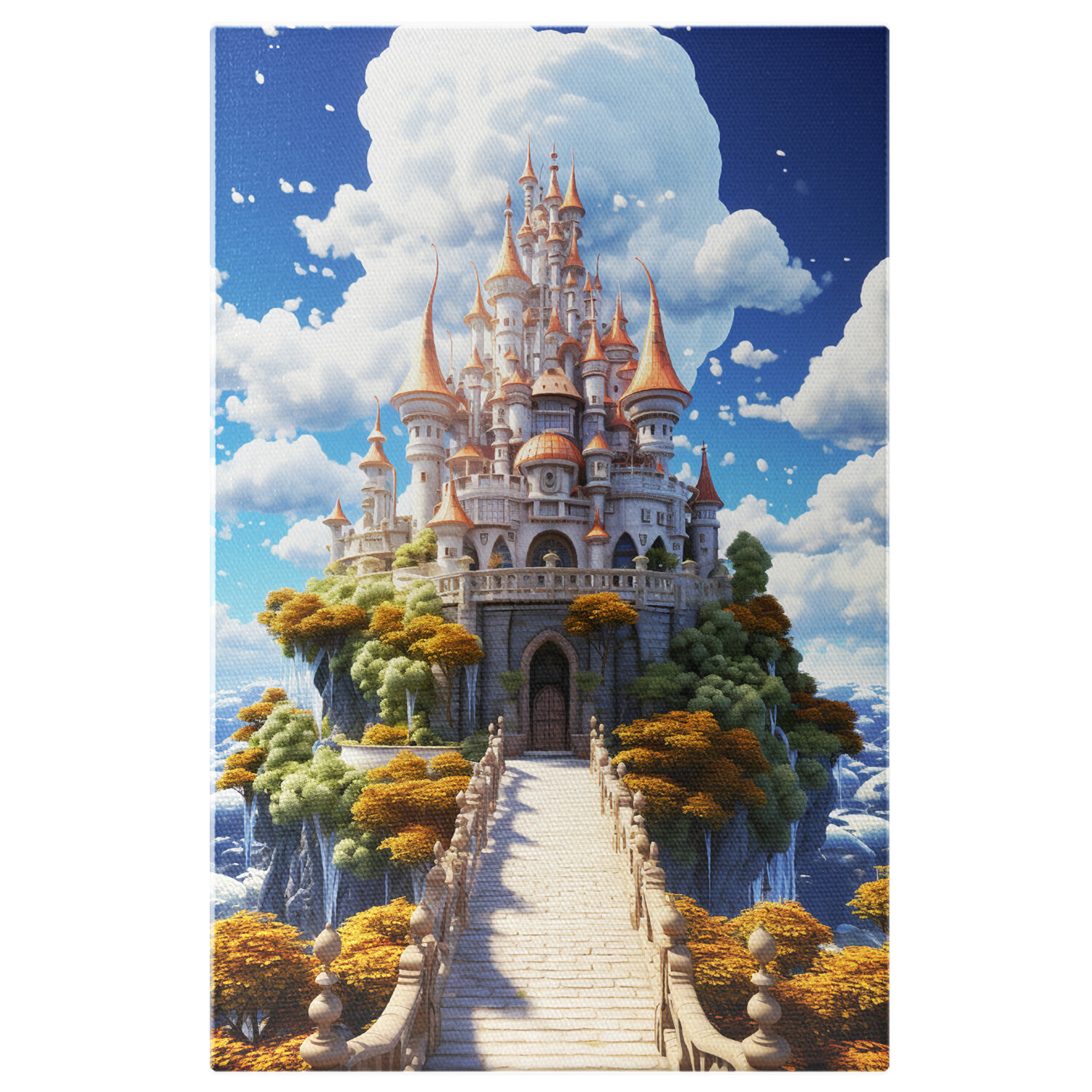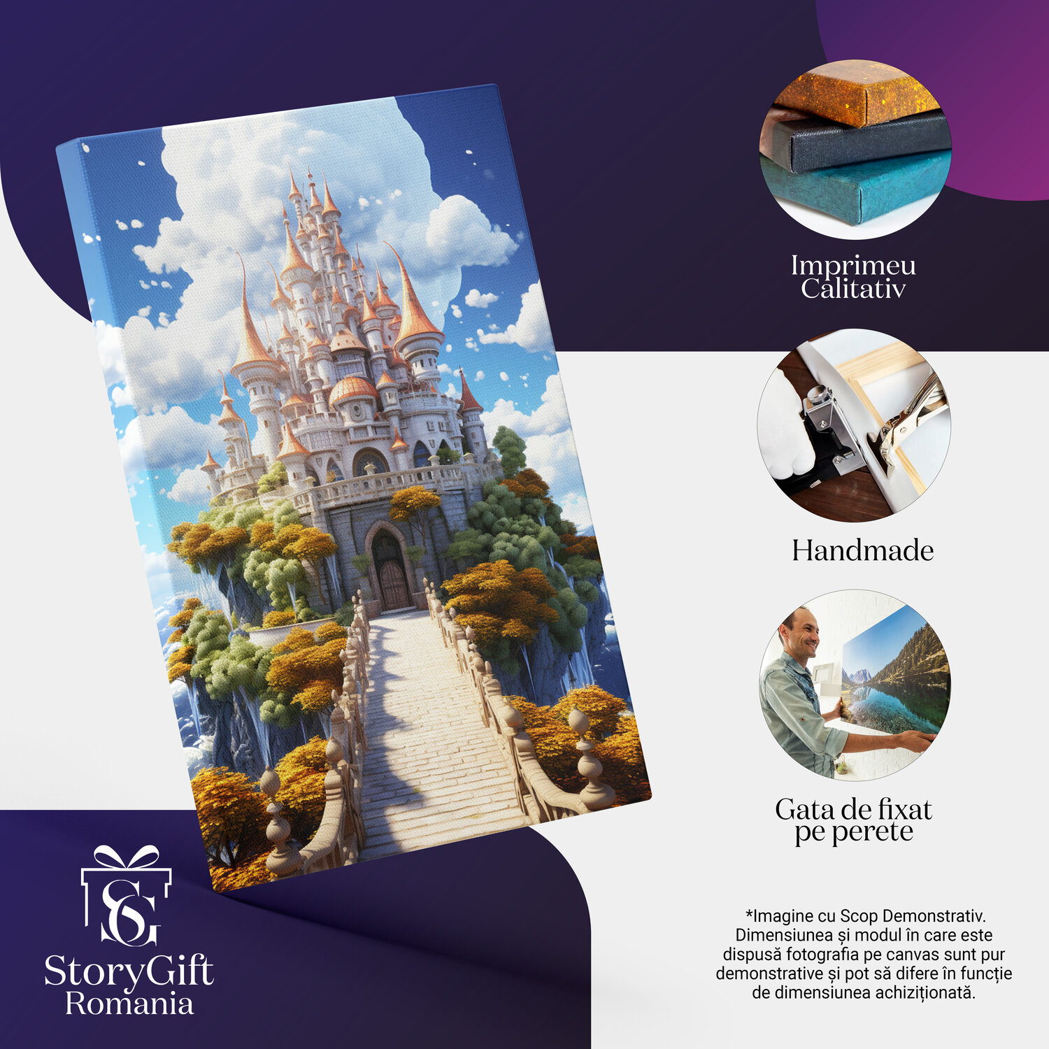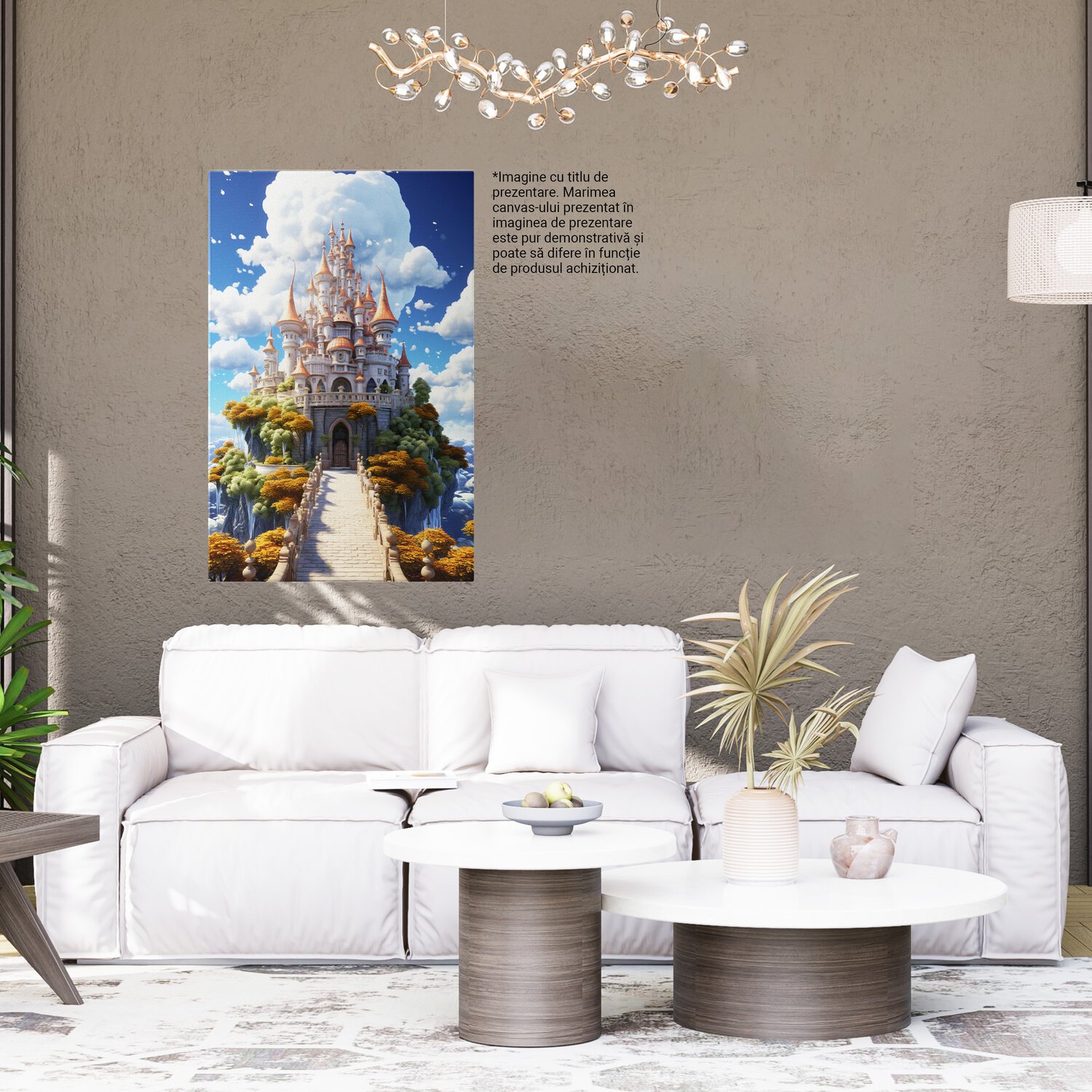 Tablou Canvas: Castelul Zgarie Nori cu un Drum Pietruit si Multi Copaci Imprejur cu un Cer si Nori Pufosi Pictura Digitala - Tablou Canvas Signature de la StoryGift Romania