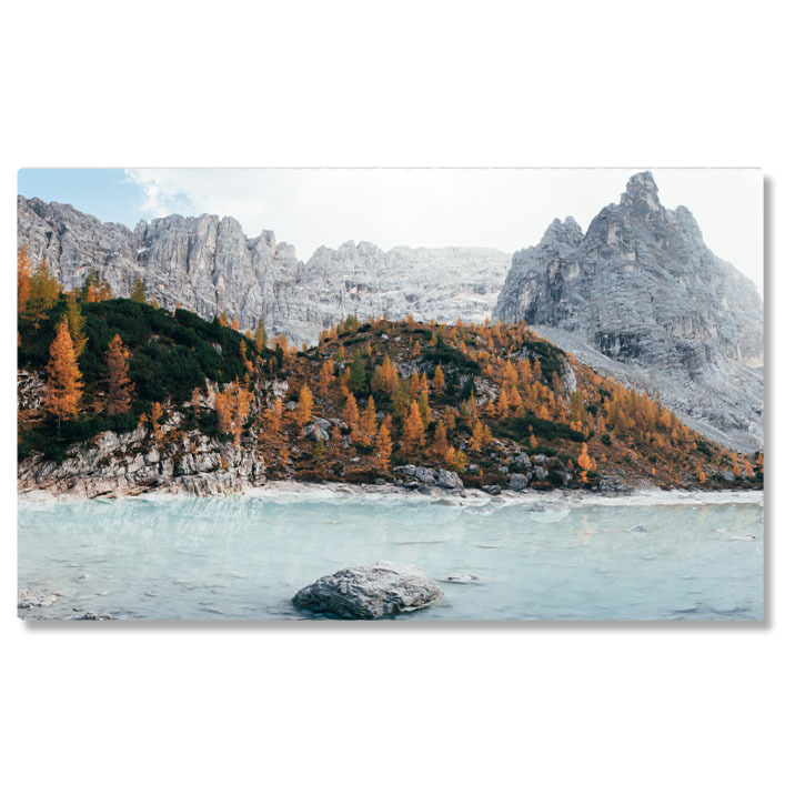 Tablou canvas cu peisaj, lac, pietre, munte, padure, toamna, multicolor 40x25CM
