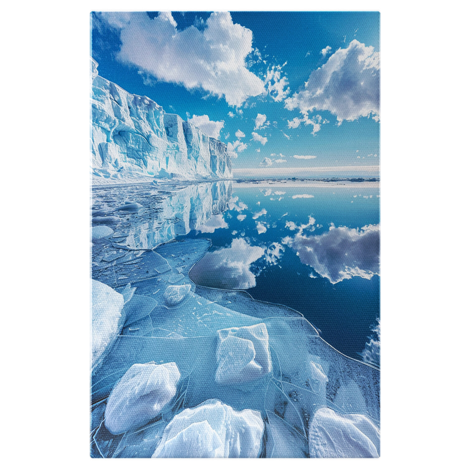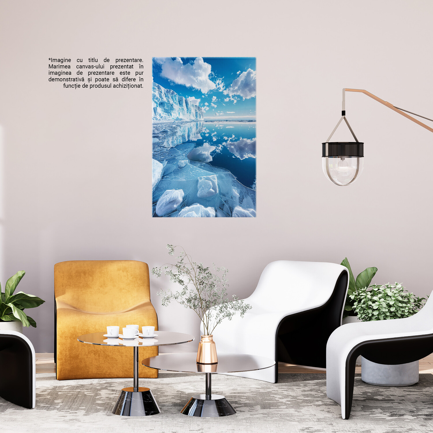 Tablou Canvas: Ocean Dezghetat si Ghetari, Reflectii in Apa si Cer cu Nori Albi Pufosi- Natura si Tonuri Albastre Pictura Digitala - Tablou Canvas Signature de la StoryGift Romania