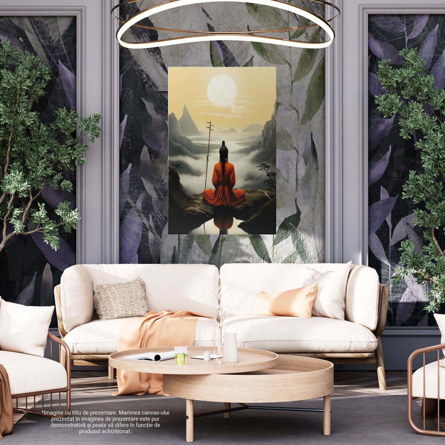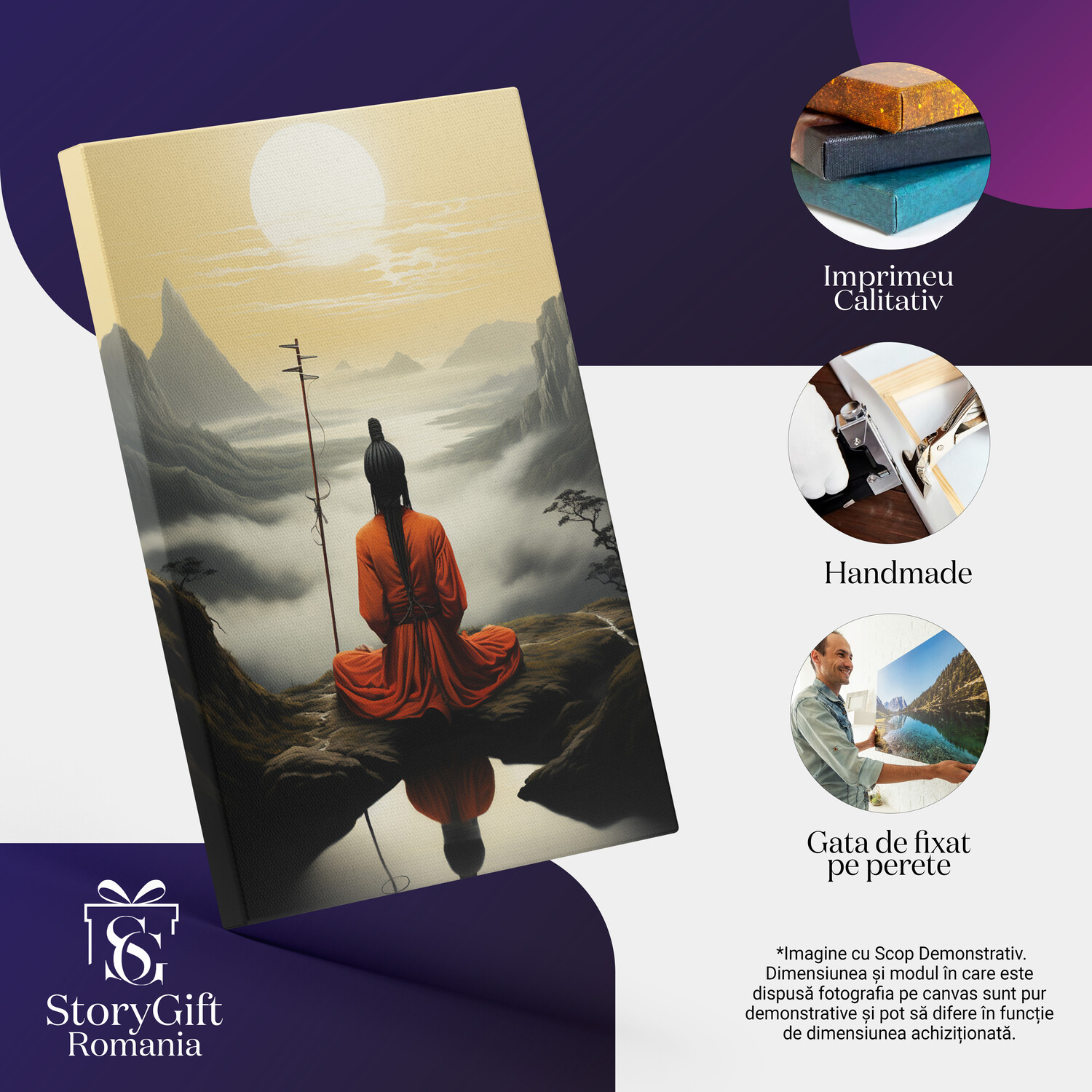 Tablou Canvas: Peisaj Asiatic Sensei Priveste Linistea Muntilor Cuprinsi de Ceata Pictura Digitala - Tablou Canvas Signature de la StoryGift Romania