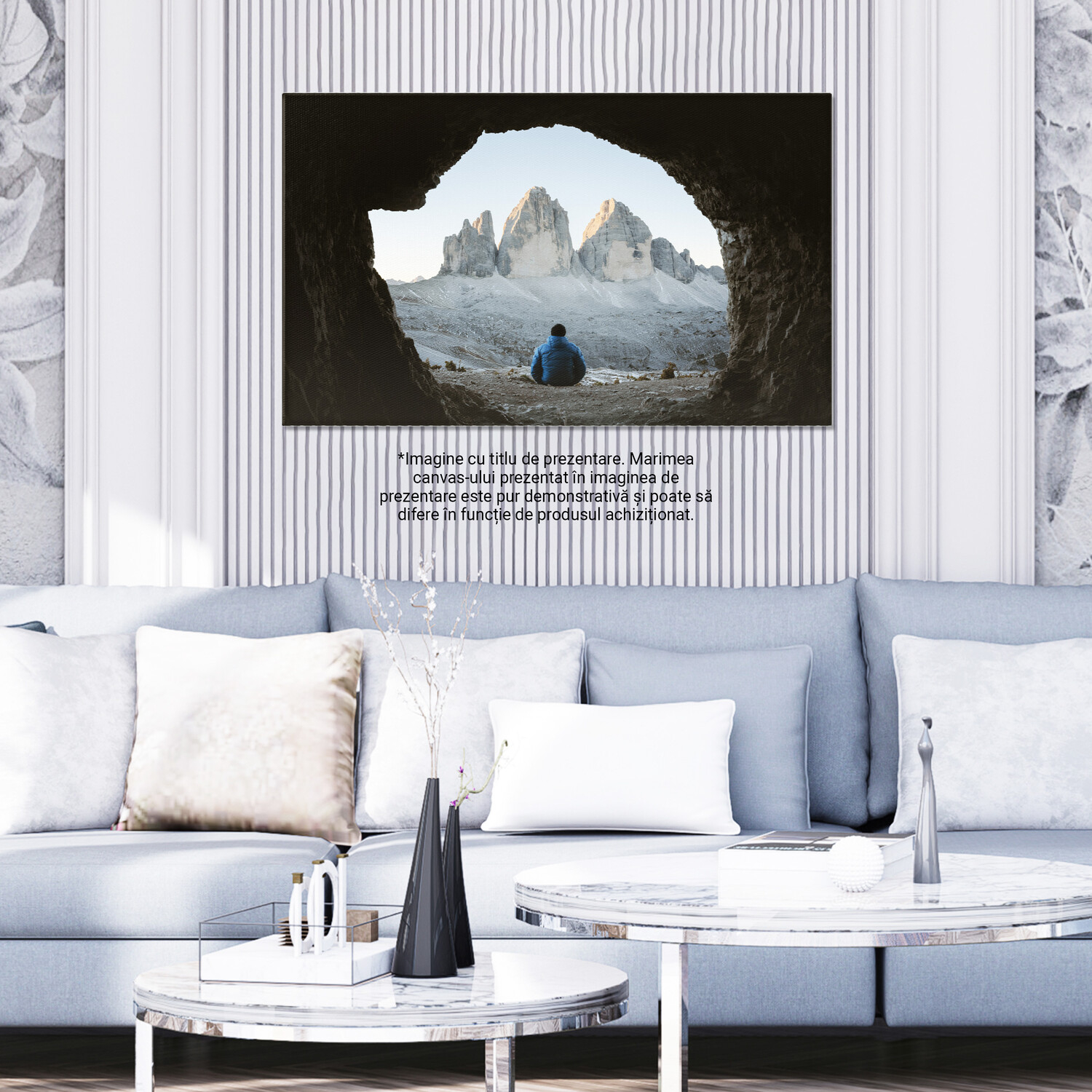 Tablou Canvas Turist Singuratic in Pestera de Munte, Dolomiti, Trei Varfuri, Munti, Peisaj Montan, Exterior