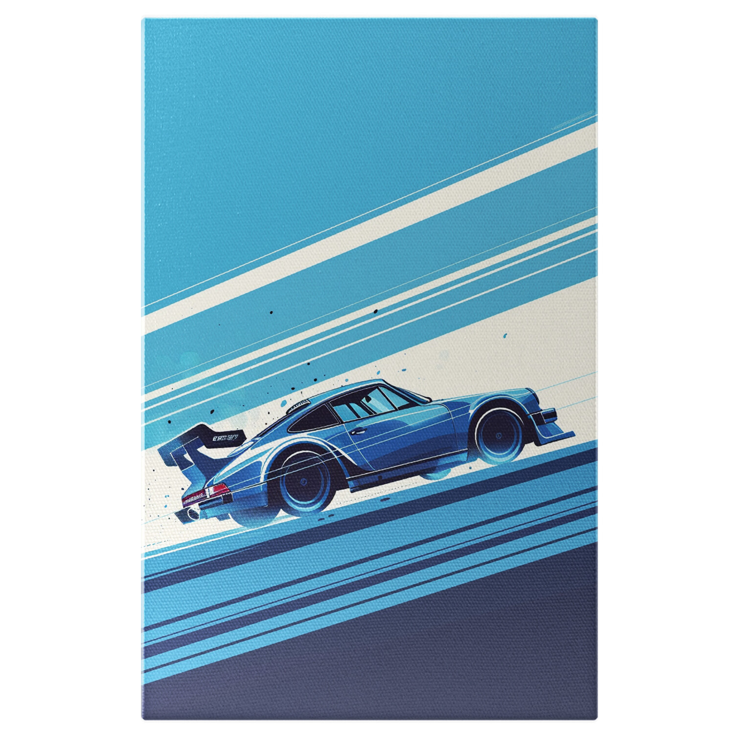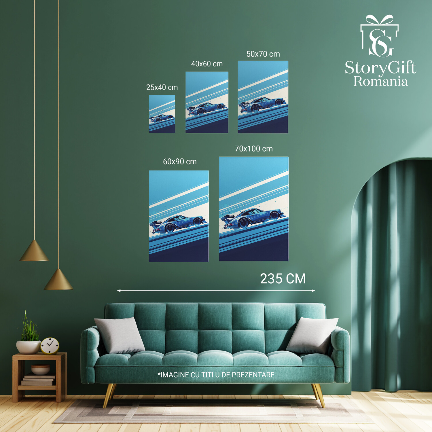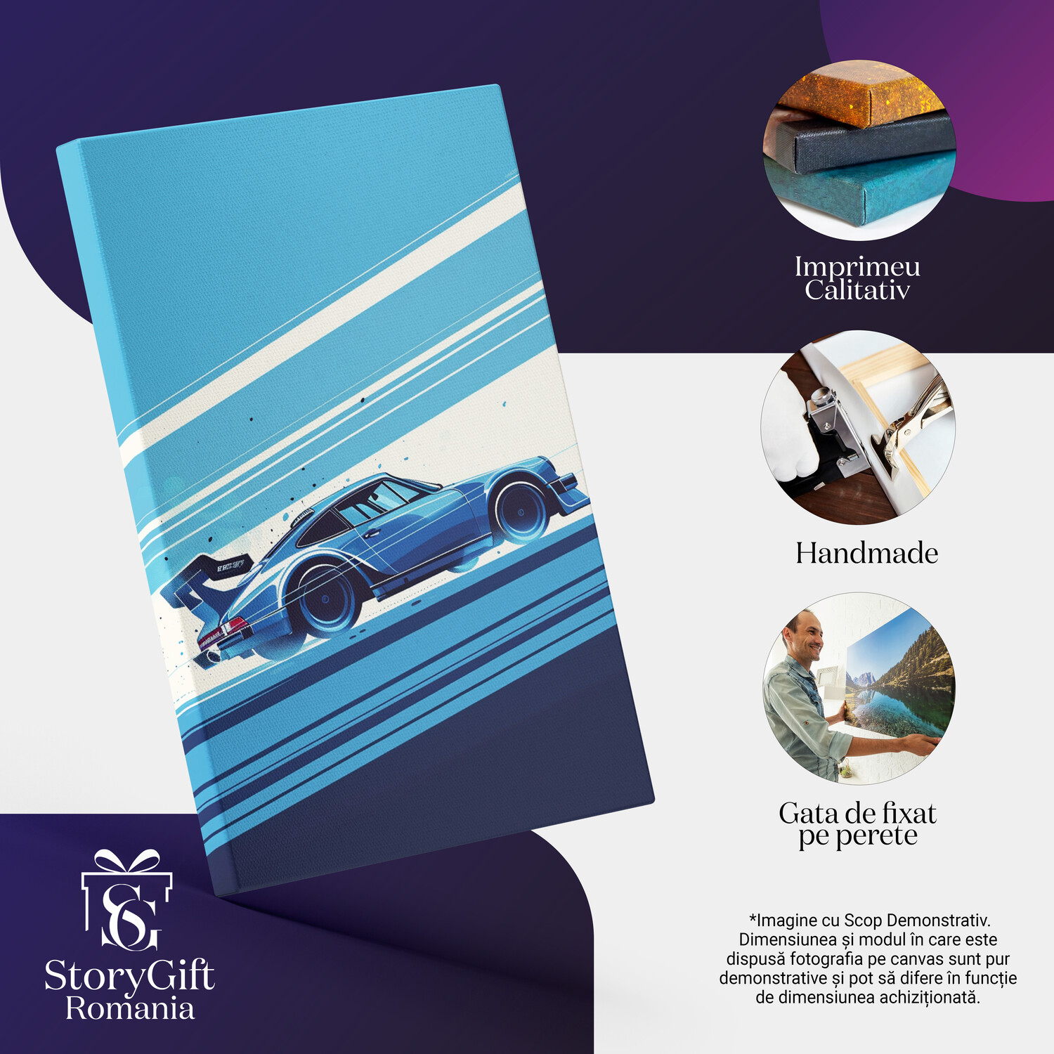 Tablou Canvas Vedere latera a unei masini albastre mergand pe linii desenate- tip comic book , Pictura Digitala - Tablou Canvas Signature de la StoryGift Romania