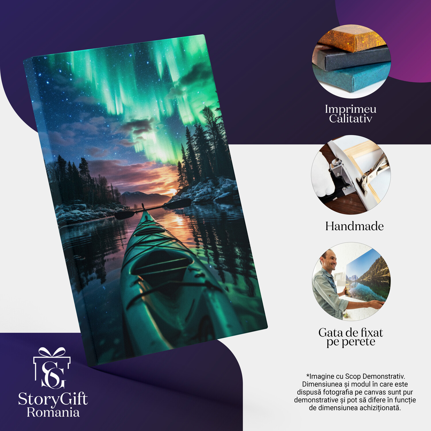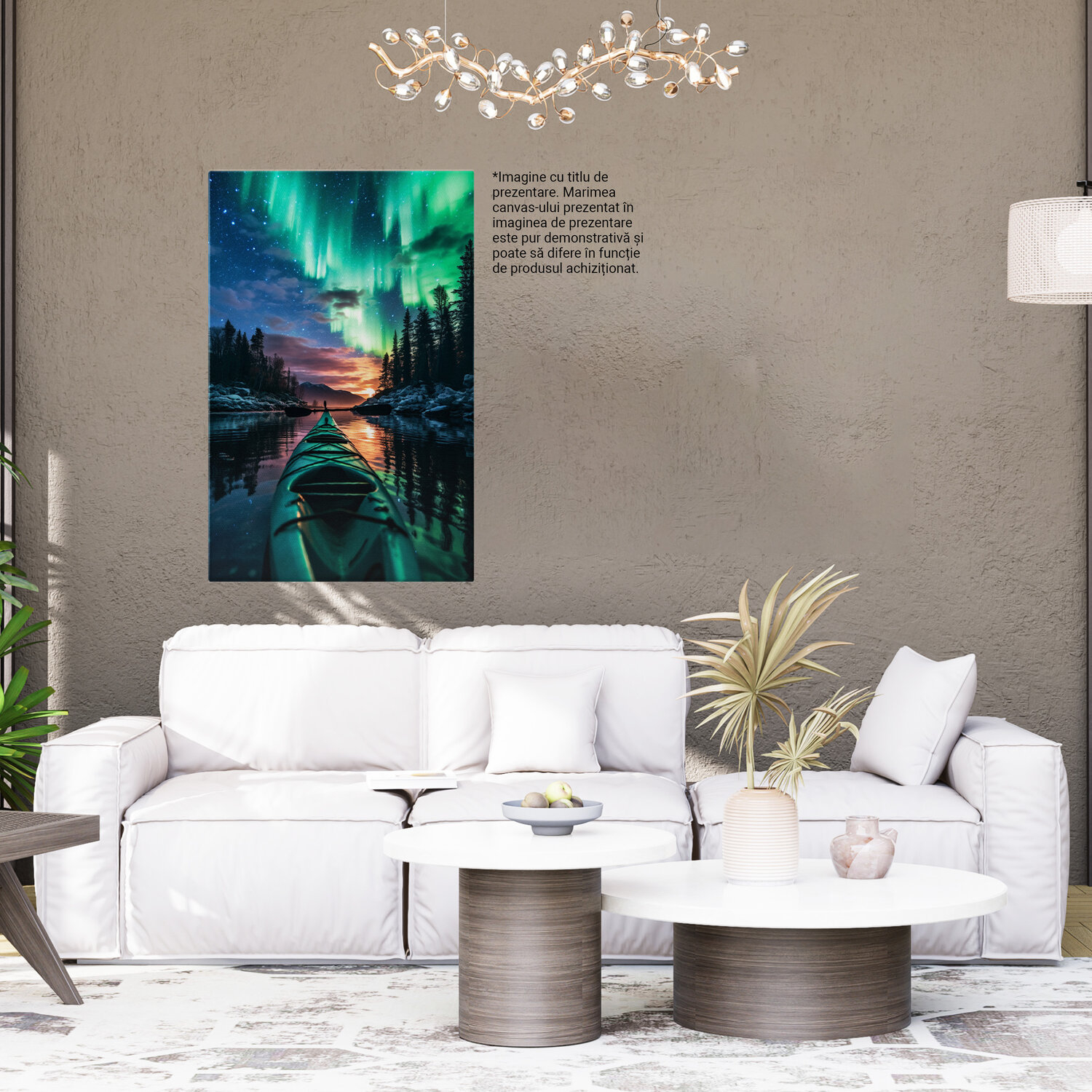 Tablou Canvas: Linistea Serii, Canoe pe Lacul Inconjurat de Brazi cu Cerul Luminat Verde-Albastru Pictura Digitala - Tablou Canvas Signature de la StoryGift Romania