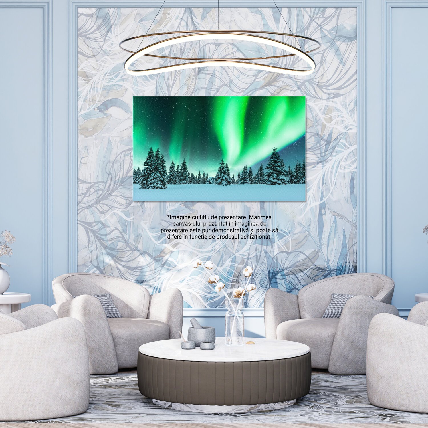 Tablou Canvas Luminile Nordului in Padurea de Iarna, Aurora Boreala, Peisaj Nordic, Munti Albastri - Tablou Canvas Signature de la StoryGift Romania