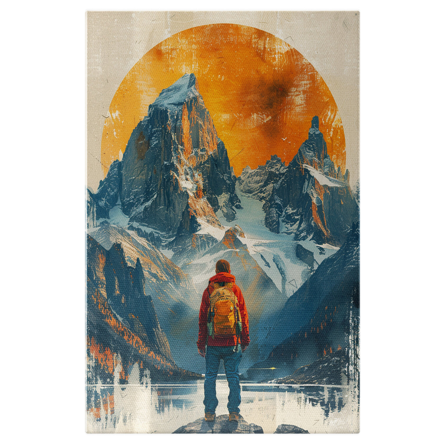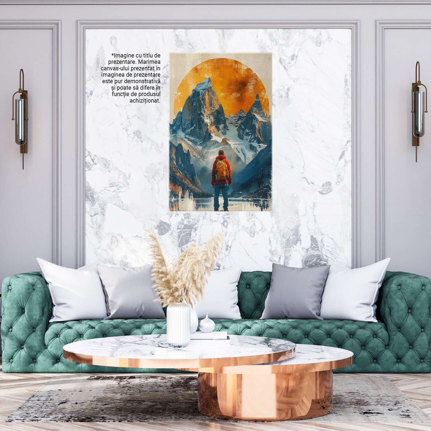 Tablou Canvas Baiatul cu Geaca Rosie si Ghiozdan in Spate sta pe o Stanca Privind Muntii cu Zapada , Pictura Digitala - Tablou Canvas Signature de la StoryGift Romania