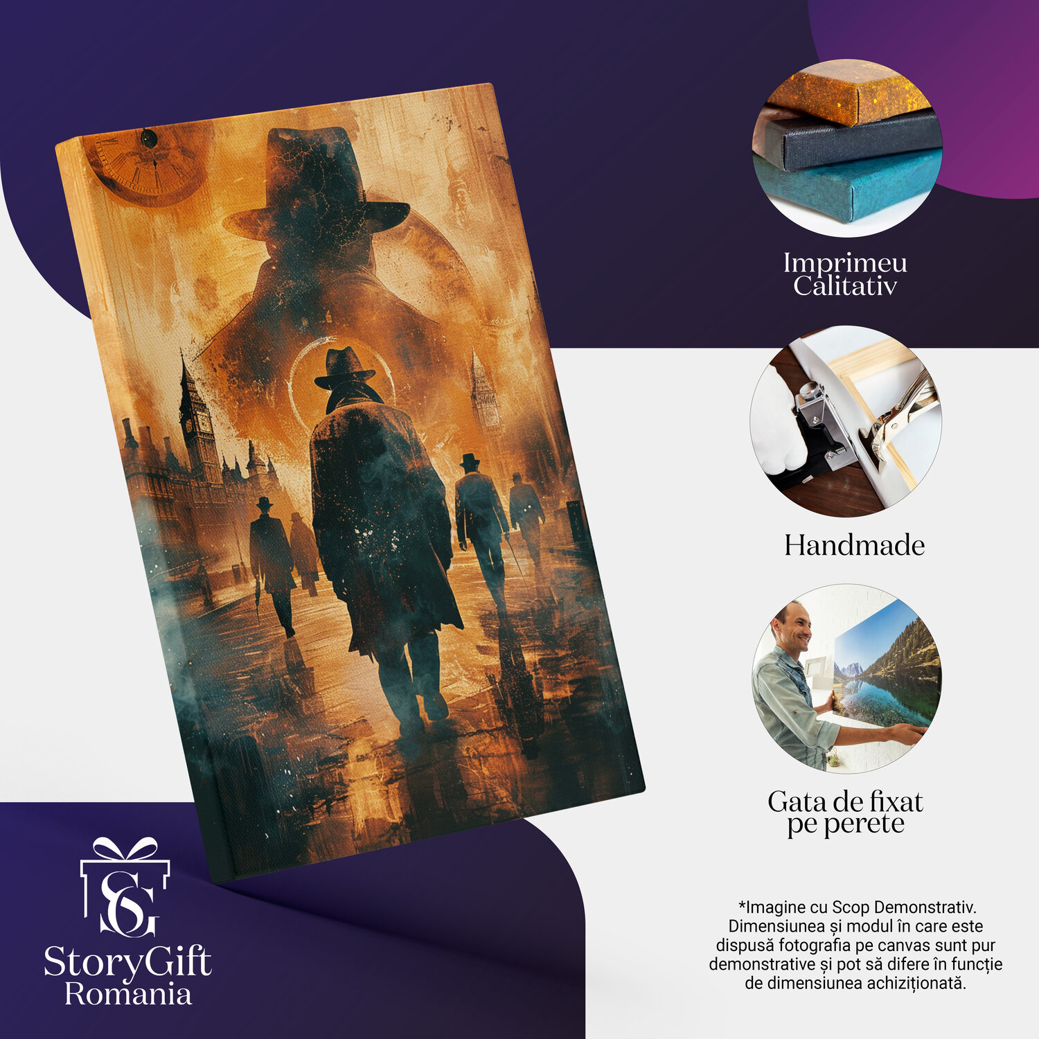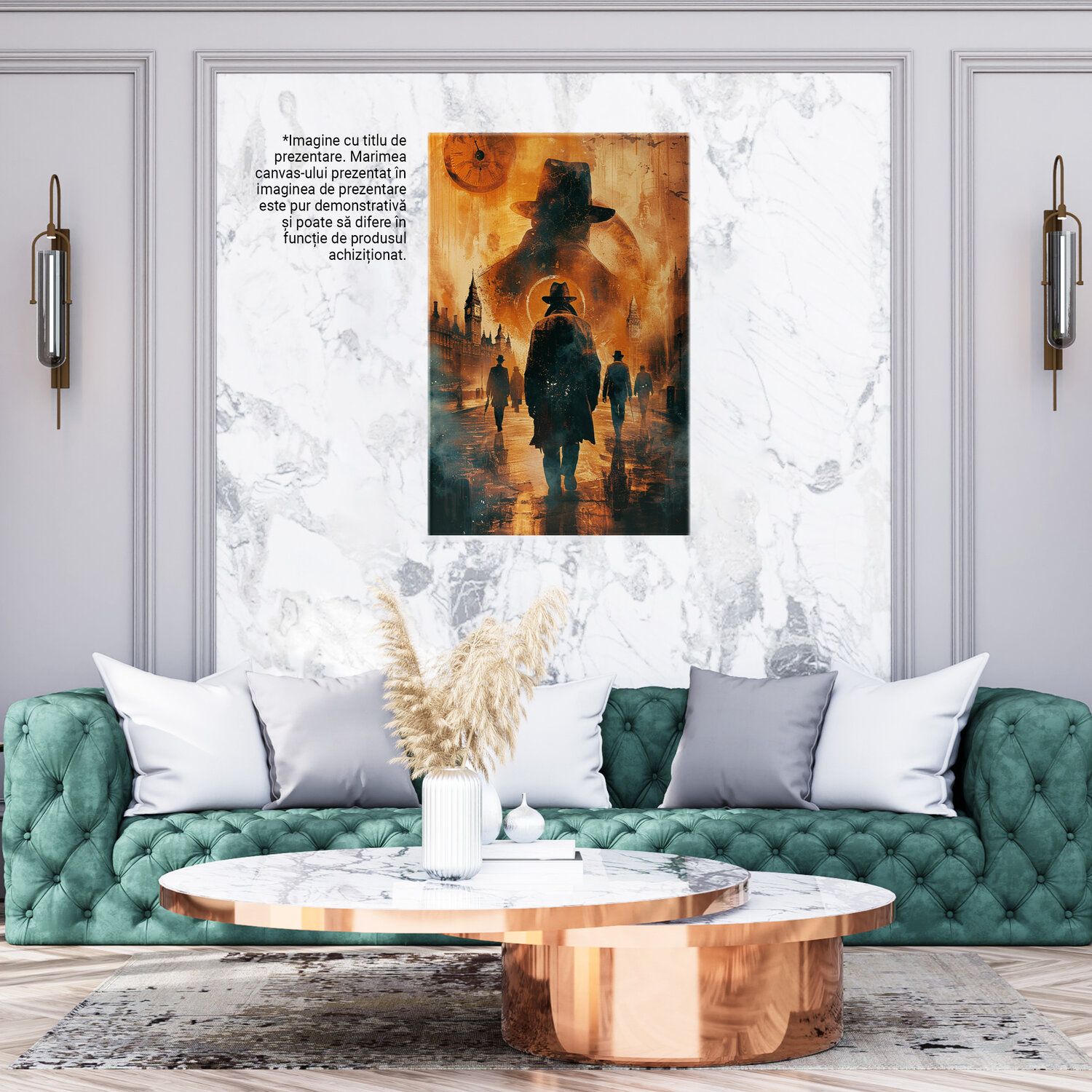 Tablou Canvas Barbati Misteriosi Imbracati cu Paltoane Negre Lungi si Palari Merg pe Strada Intunecata , Pictura Digitala 40x25CM