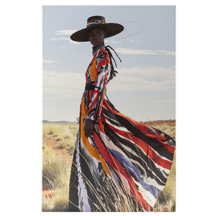 Tablou Canvas: Singurătate Plăcută Silueta în Rochie Colorată cu Pălărie în Pistiul Secetei Pictura Digitala 40x25CM