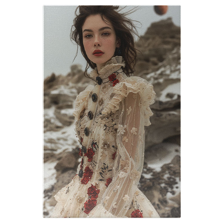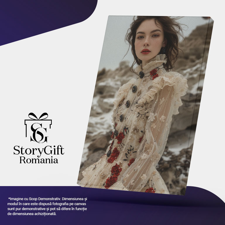 Tablou Canvas Fata in Rochie Alba cu Maneci Transparente si Nasturi cu Model de Trandafiri si Pistrui , Pictura Digitala 40x25CM
