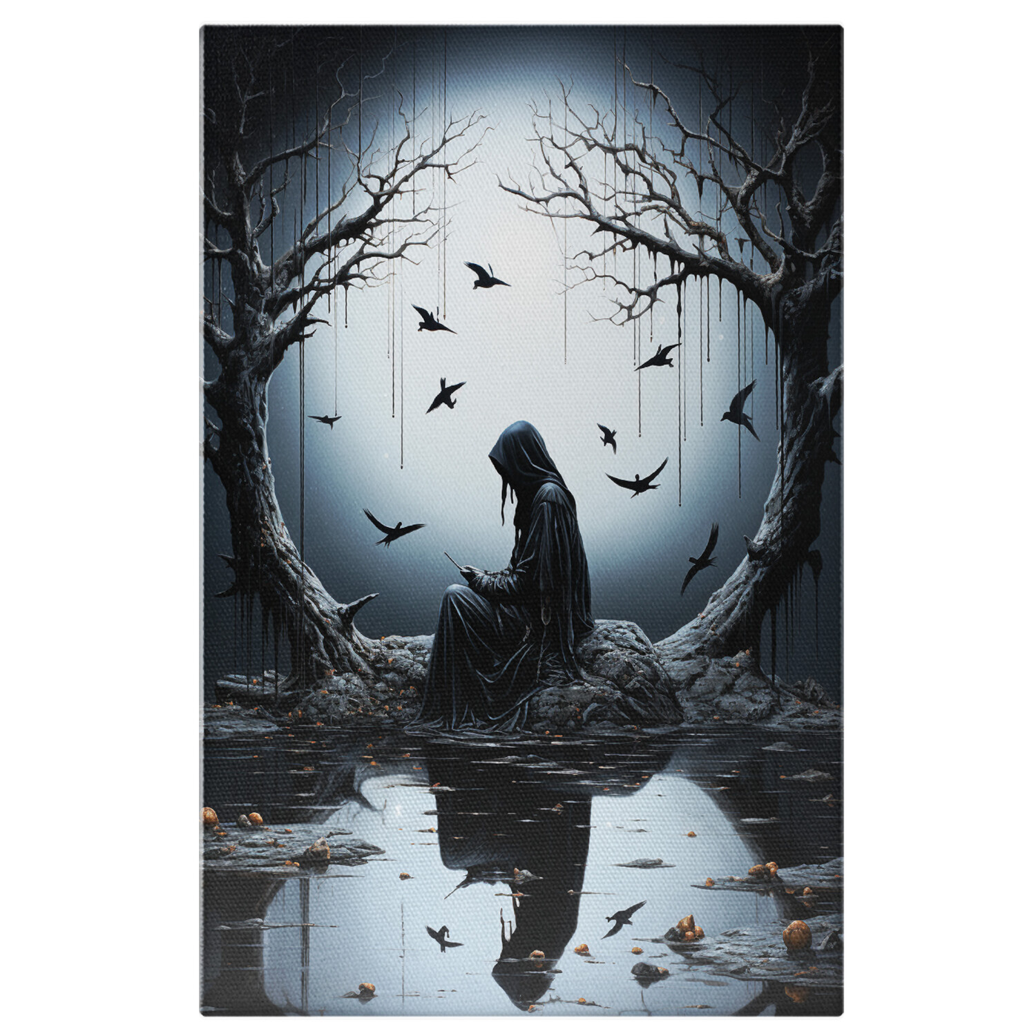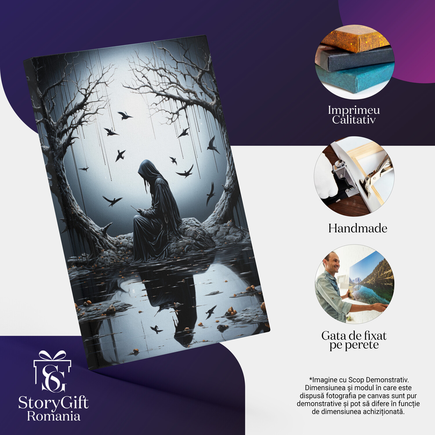 Tablou Canvas: Ilustratie cu o femeie care sta pe o piatra - luna plina pasari sumbru Pictura Digitala - Tablou Canvas Signature de la StoryGift Romania