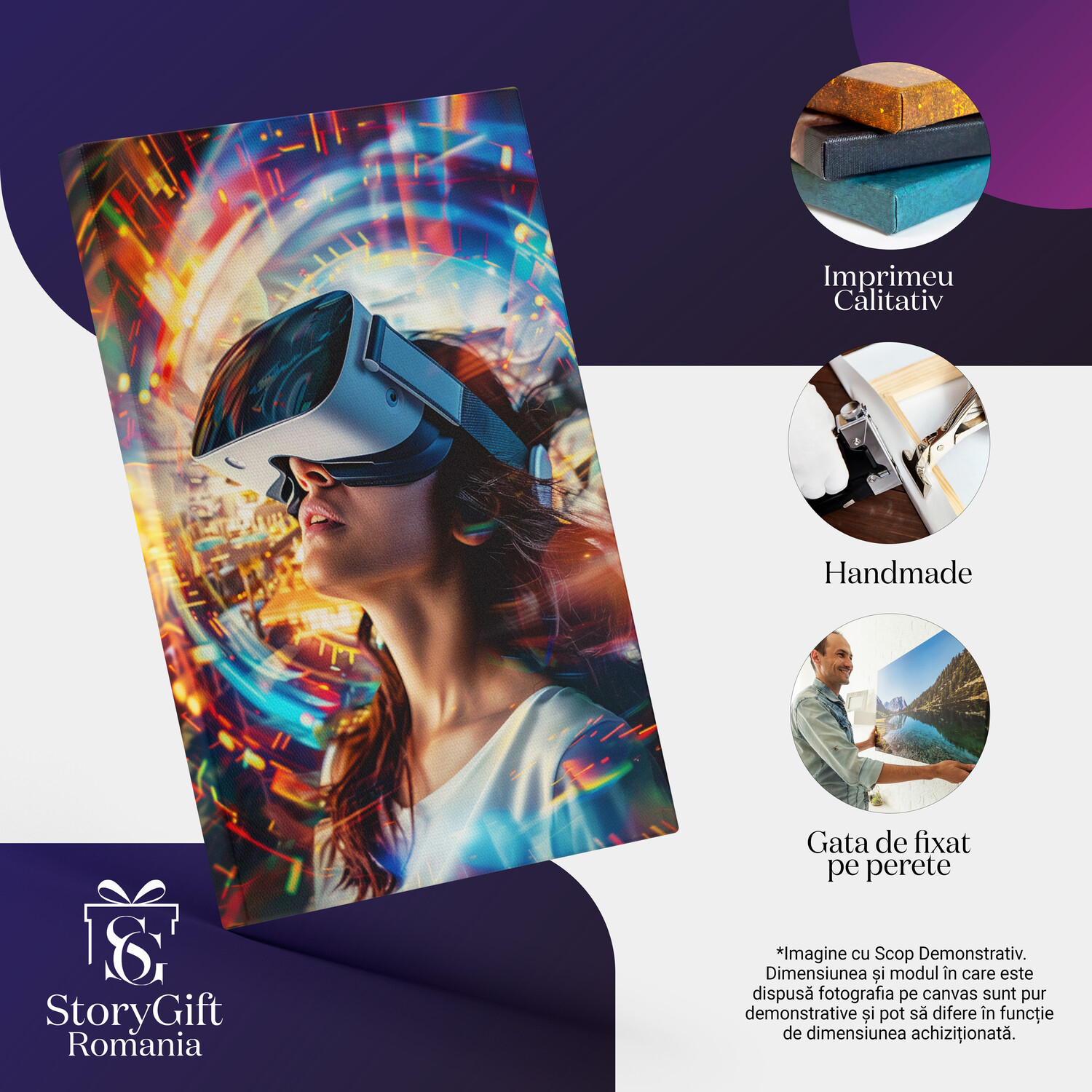 Tablou Canvas Incercarea Ochelarilor Virtuali, Tanara care Probeaza Ochelarii Virtuali cu Parul Lung in Rochie , Pictura Digitala - Tablou Canvas Signature de la StoryGift Romania