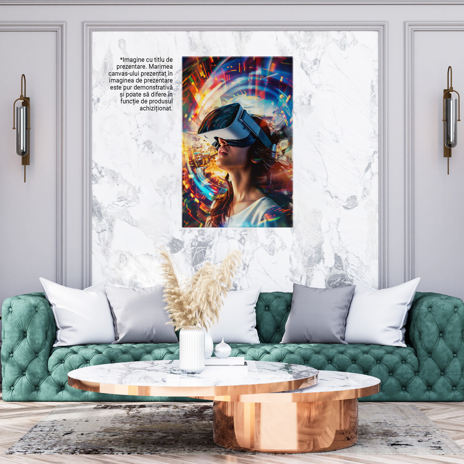 Tablou Canvas Incercarea Ochelarilor Virtuali, Tanara care Probeaza Ochelarii Virtuali cu Parul Lung in Rochie , Pictura Digitala 90x60CM