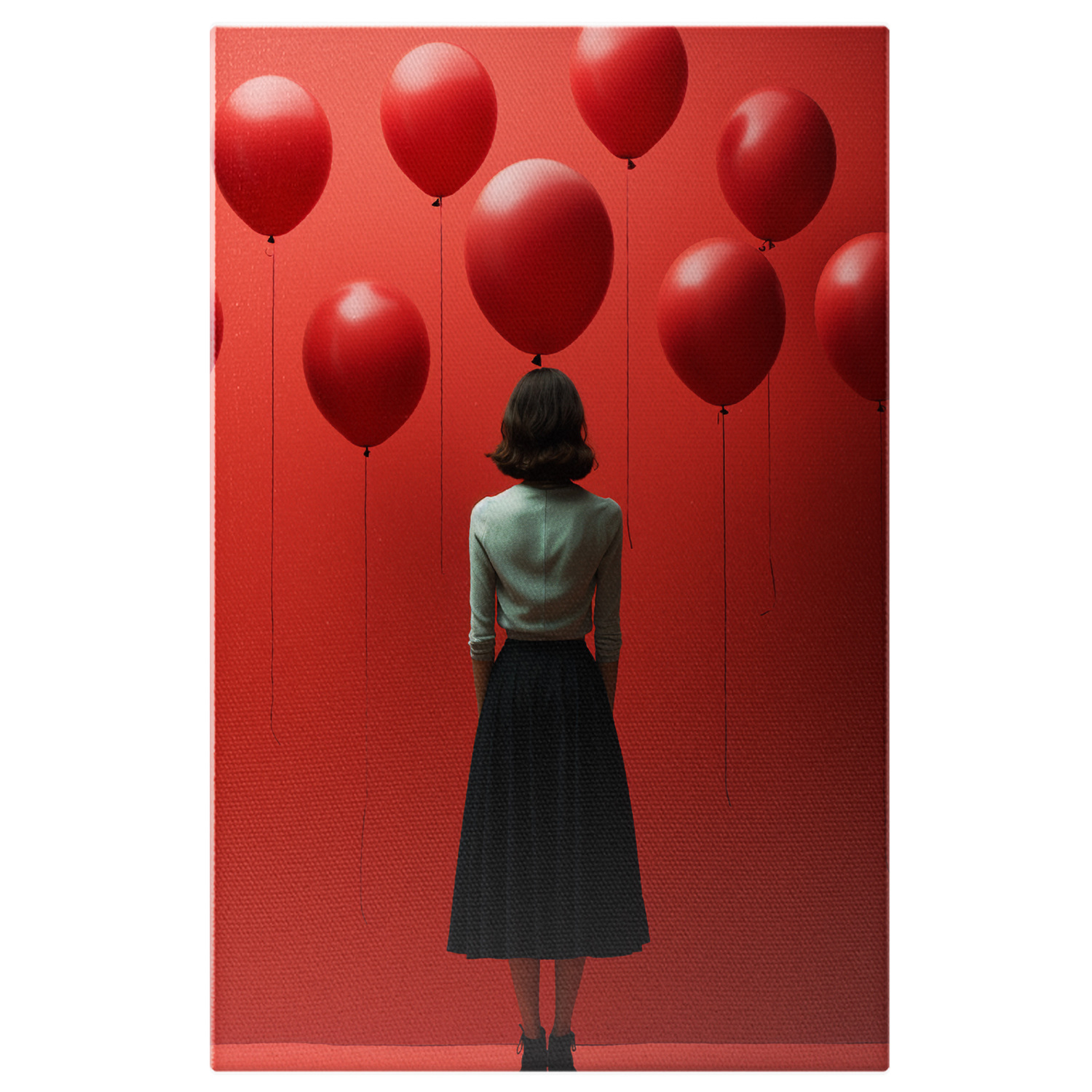 Tablou Canvas: O femeie care se uita la niste baloane rosii - pereti rosii abstract Pictura Digitala - Tablou Canvas Signature de la StoryGift Romania