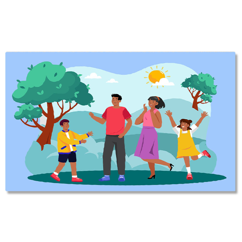Tablou Canvas Fetita si Baietelul Fratiorii Veseli Impreuna cu Parintii in Parc cu Soarele pe Cer printre Copaci 40x25CM