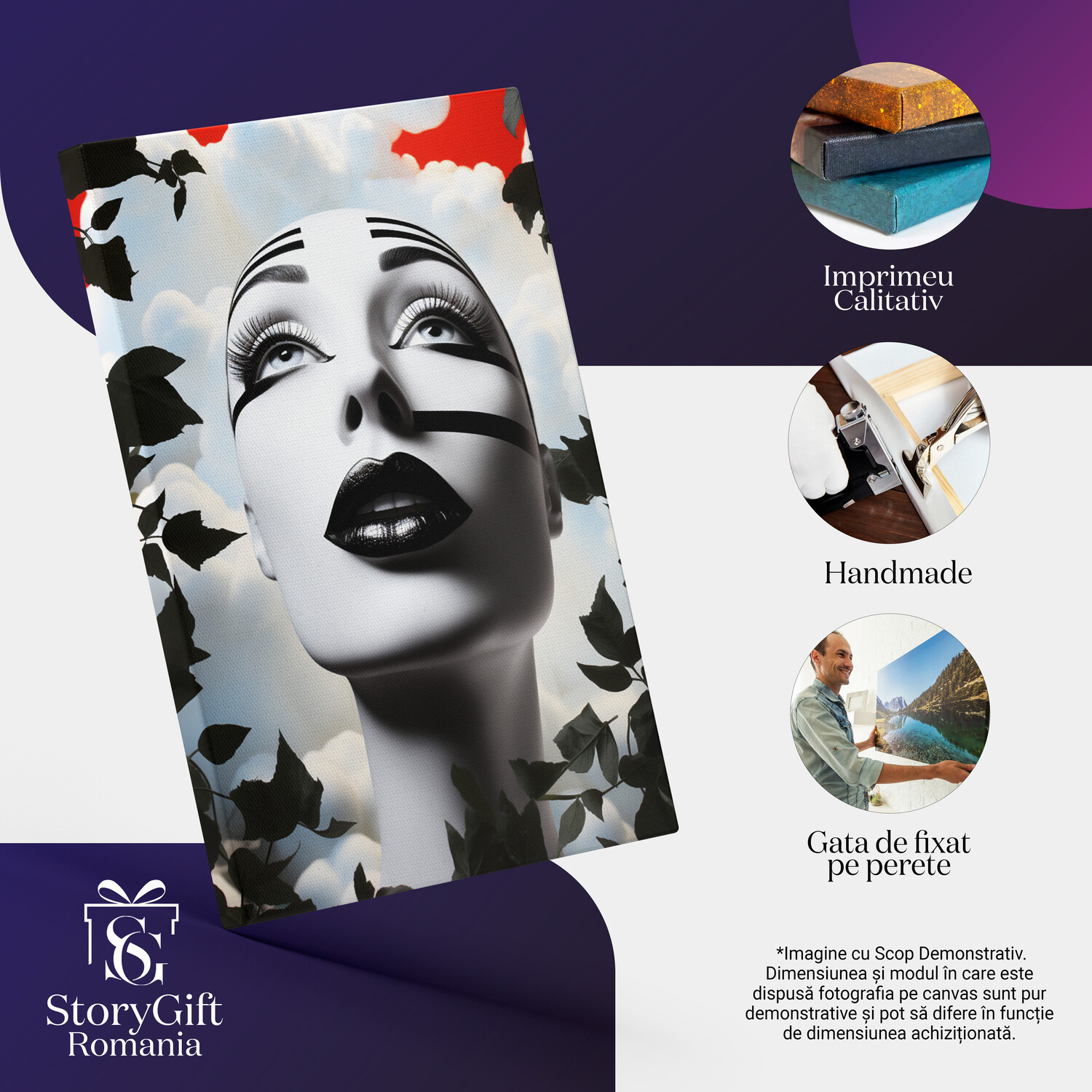 Notă importantă: Precizăm că imaginile de pe site au scop ilustrativ. Detaliile reale ale produsului pot prezenta diferențe minore față de reprezentările digitale, datorită variațiilor de culoare, mărimea tabloului și rezoluția dispozitivelor. Disponibilitatea în diverse dimensiuni ne permite să satisfacem nevoile dvs. specifice; pentru a vă asigura de alegerea potrivită, recomandăm măsurarea atentă a spațiului alocat.
