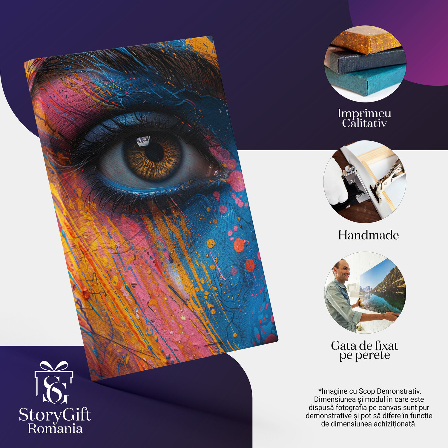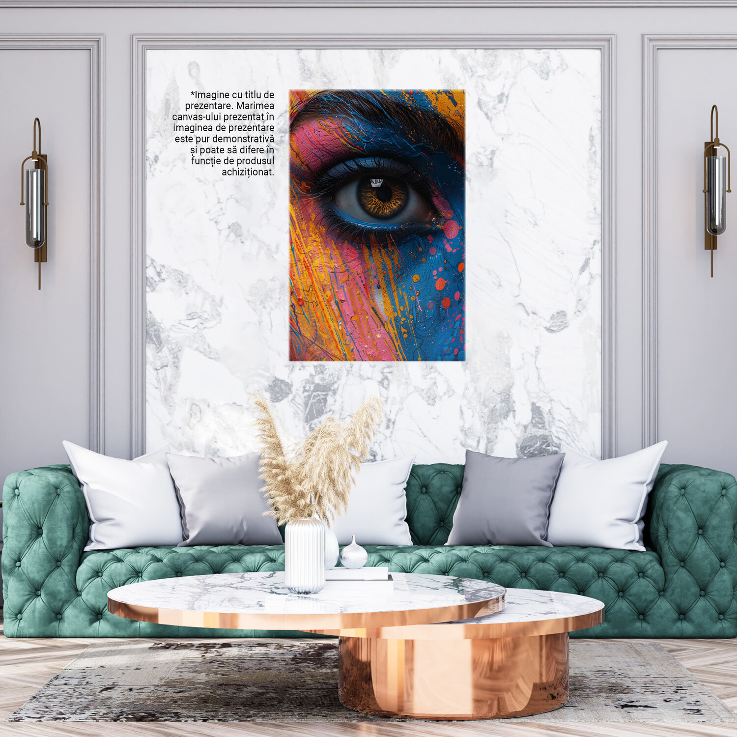 Notă importantă: Precizăm că imaginile de pe site au scop ilustrativ. Detaliile reale ale produsului pot prezenta diferențe minore față de reprezentările digitale, datorită variațiilor de culoare, mărimea tabloului și rezoluția dispozitivelor. Disponibilitatea în diverse dimensiuni ne permite să satisfacem nevoile dvs. specifice; pentru a vă asigura de alegerea potrivită, recomandăm măsurarea atentă a spațiului alocat.