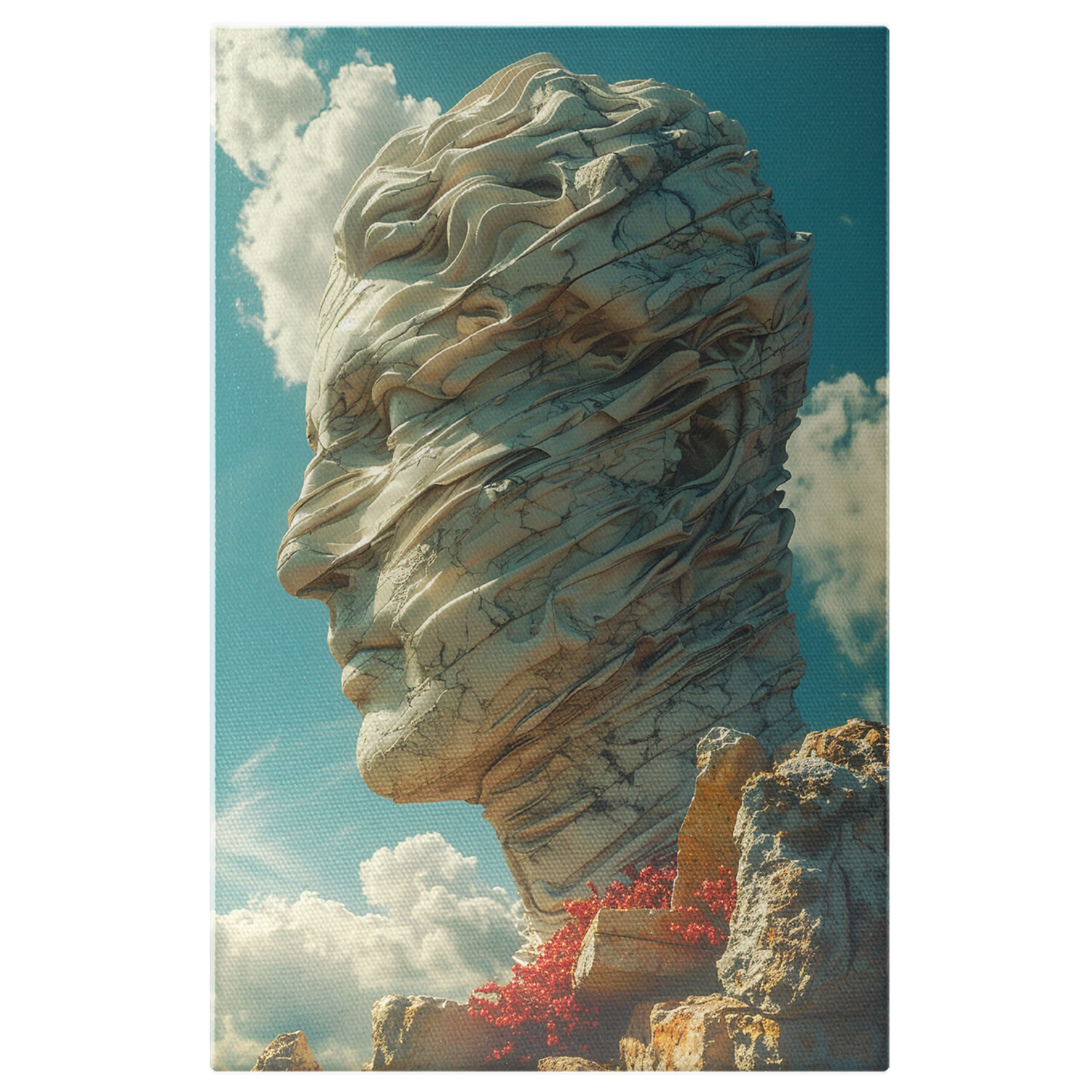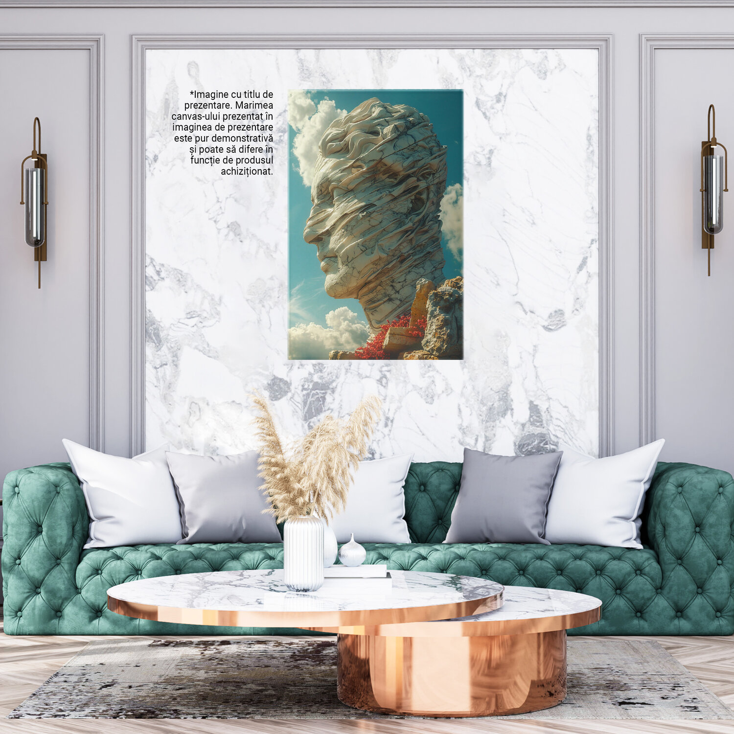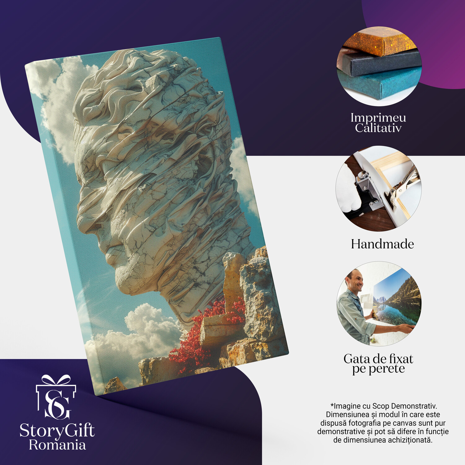 Tablou Canvas Statuie Chip Masculin in Varful unei Stanci cu Floricele Roz in Jur si Verdeata cu Cerul Senin , Pictura Digitala 90x60CM