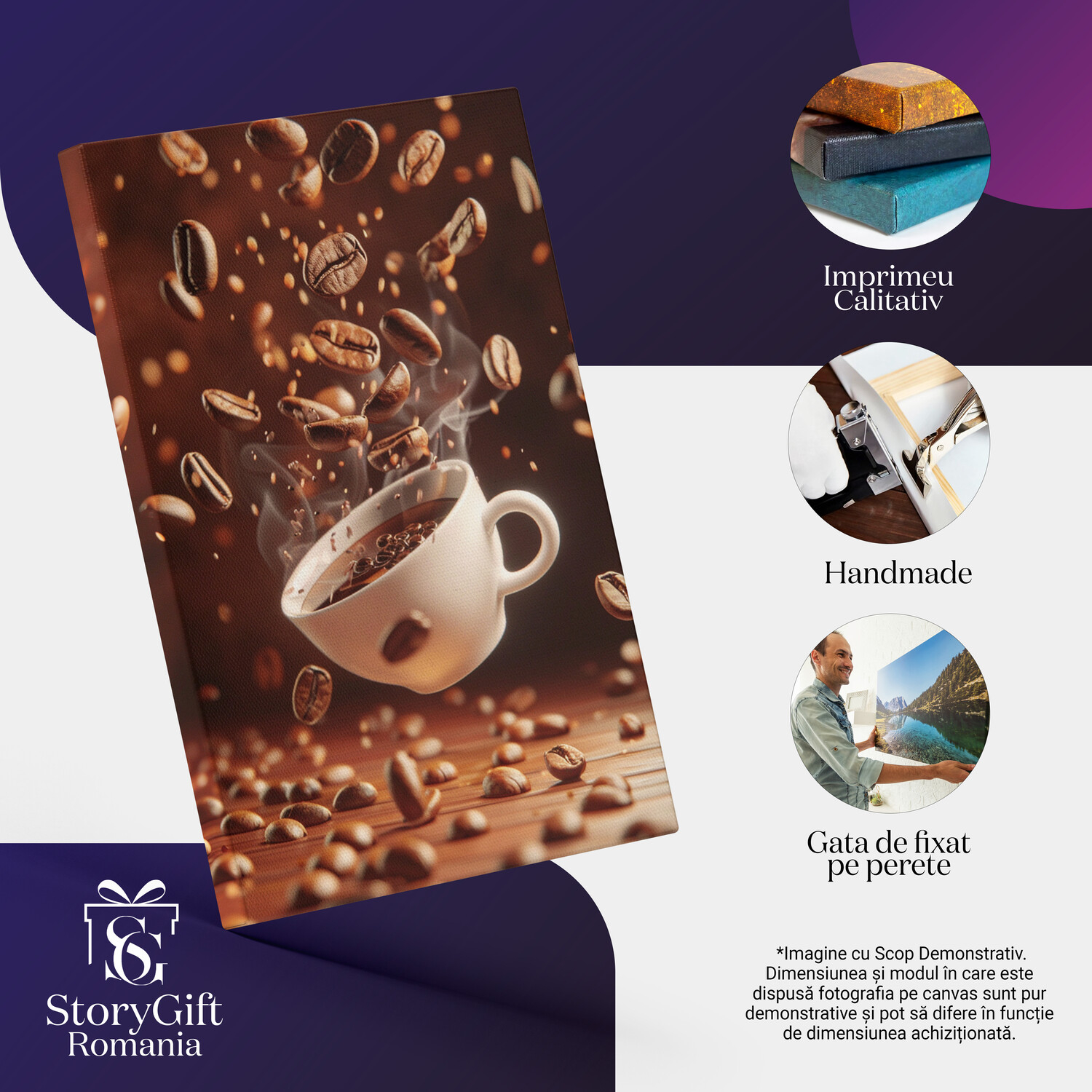 Tablou Canvas Ceasca Alba de Cafea cu Boabe Imprejurul ei, Imagine Perfecta pentru Iubitorii de Cafea , Pictura Digitala - Tablou Canvas Signature de la StoryGift Romania
